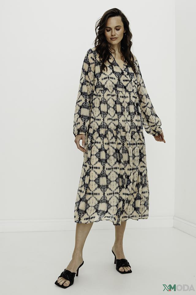 Модель имеет удобный V-образный вырез и длинные рукава, слегка собранные у манжет, что добавляет образу женственности. Платье выполнено из 100% полиэстера, что обеспечивает легкость и комфорт в носке. Подкладка выполнена из 100% вискозы.