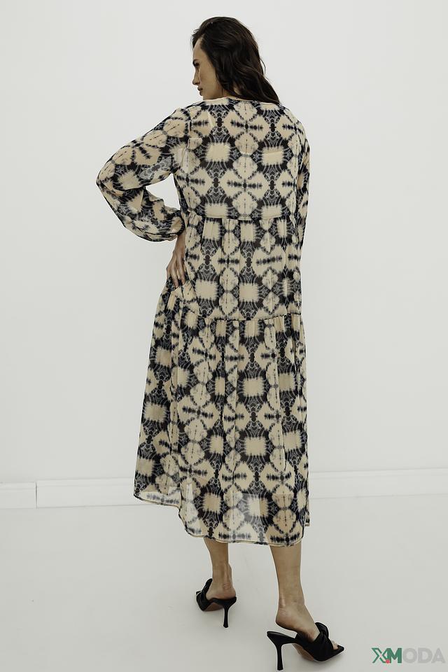 Платье от Comma бежевого цвета с оригинальным принтом в стиле тай-дай. Модель выполнена из лёгкой ткани, имеет V-образный вырез и рукава три четверти, что делает его идеальным выбором для тёплой погоды. Состав: полиэстер 100%, Состав_подкладка вискоза 100%