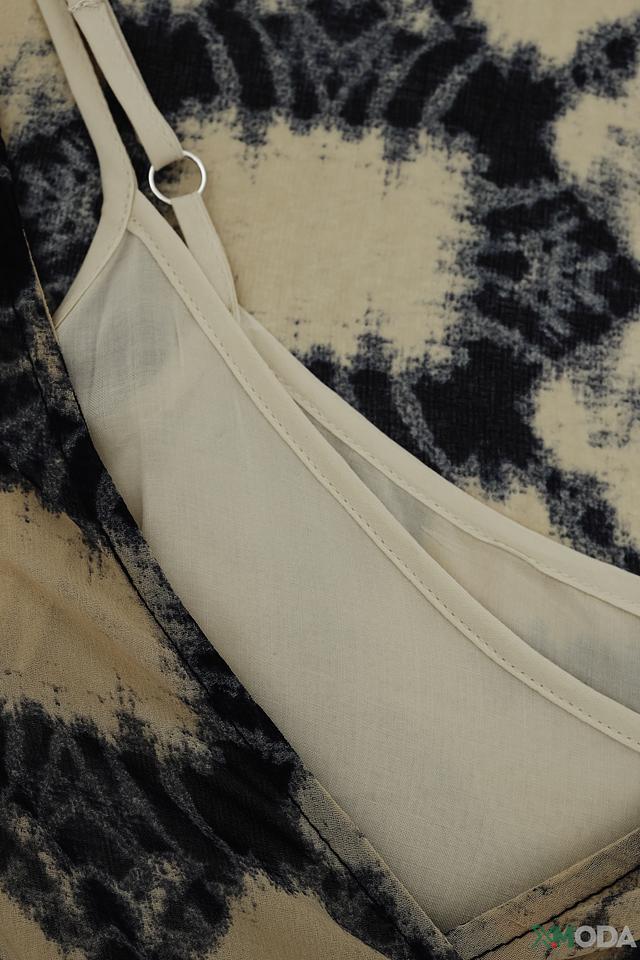 Это стильное платье от бренда Comma станет прекрасным дополнением к вашему гардеробу. Платье выполнено в бежевой цветовой гамме и украшено эффектным принтом в технике тай-дай, который придает ему неповторимый и современный вид.