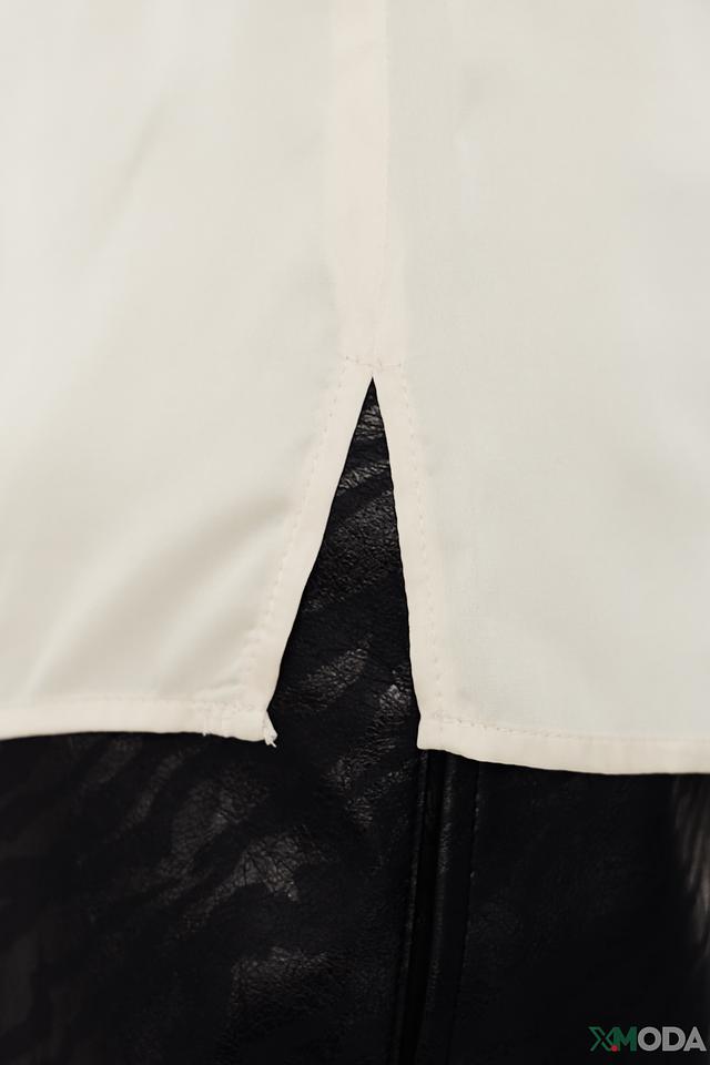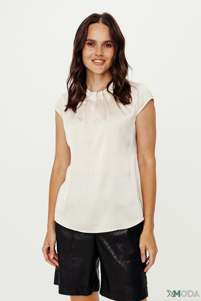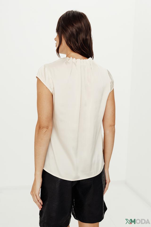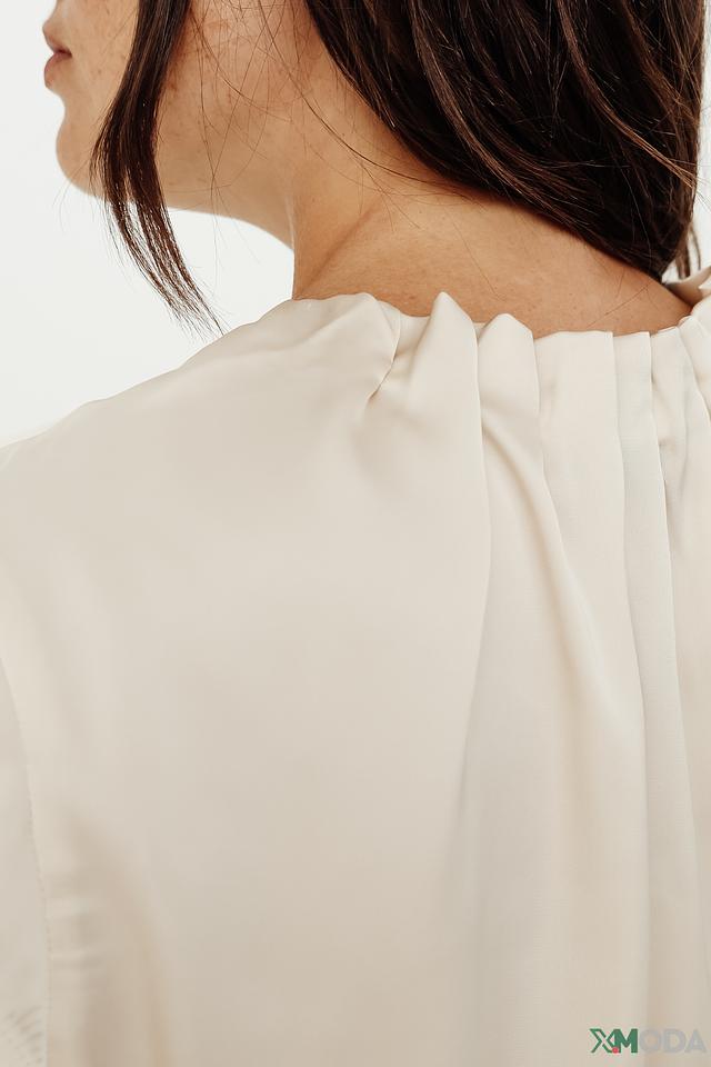 Блуза имеет кремовый цвет и свободный крой, который не сковывает движения. Короткие рукава-фонарики придают образу романтичность и лёгкость. Округлый вырез горловины аккуратно обрамляет лицо.
