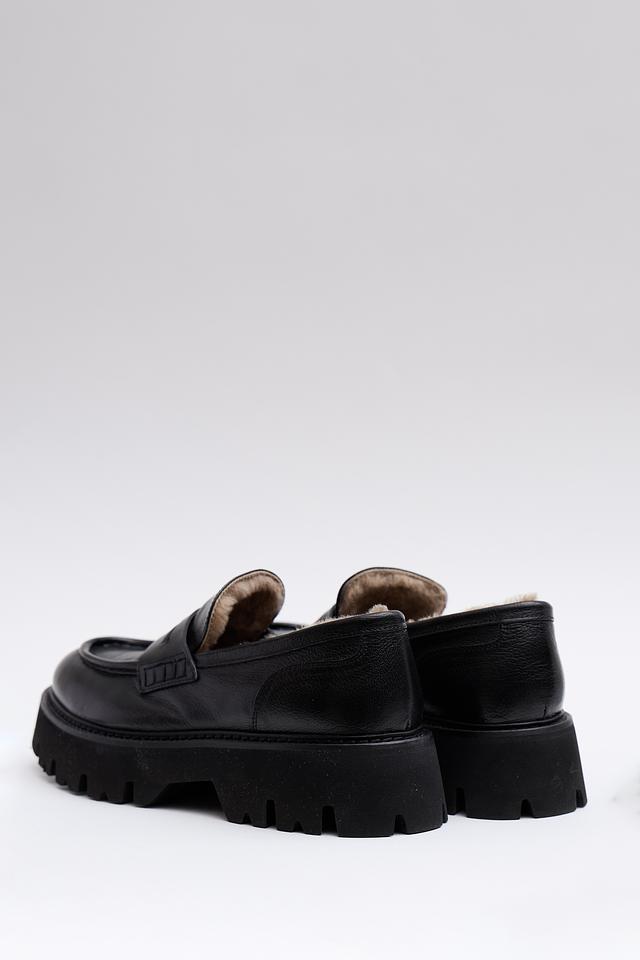Верх лоферов изготовлен из высококачественной натуральной кожи, что гарантирует долговечность и комфорт при носке. Внутренняя часть обуви утеплена мехом, обеспечивая тепло и уют даже в холодную погоду. Массивная резиновая подошва не только придает обуви современный вид, но и обеспечивает отличное сцепление с поверхностью.