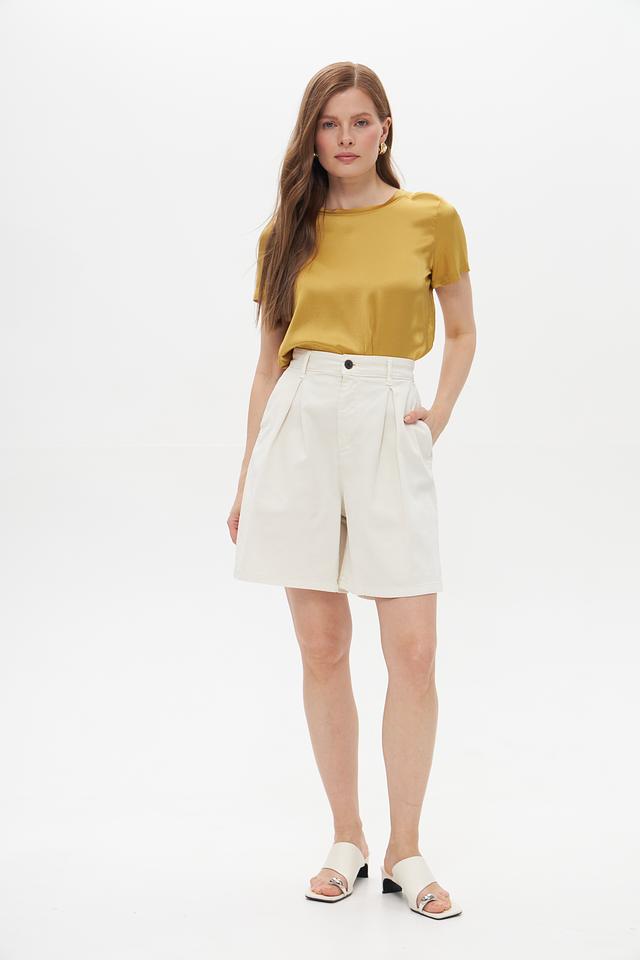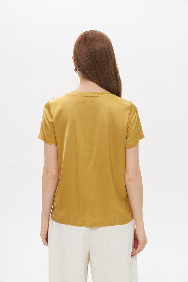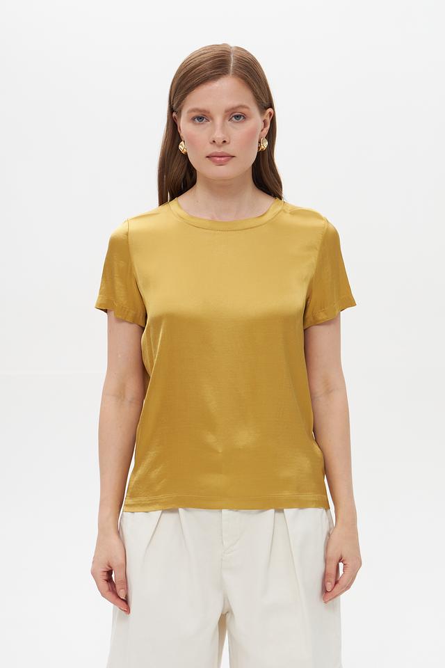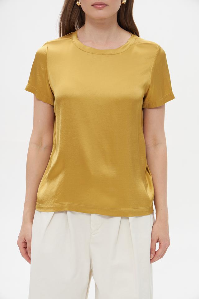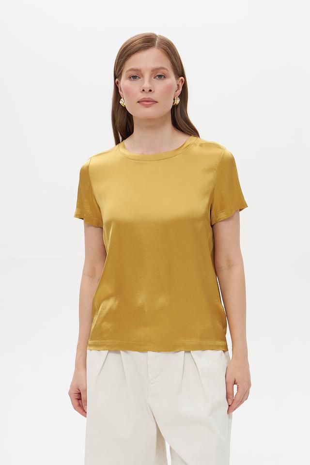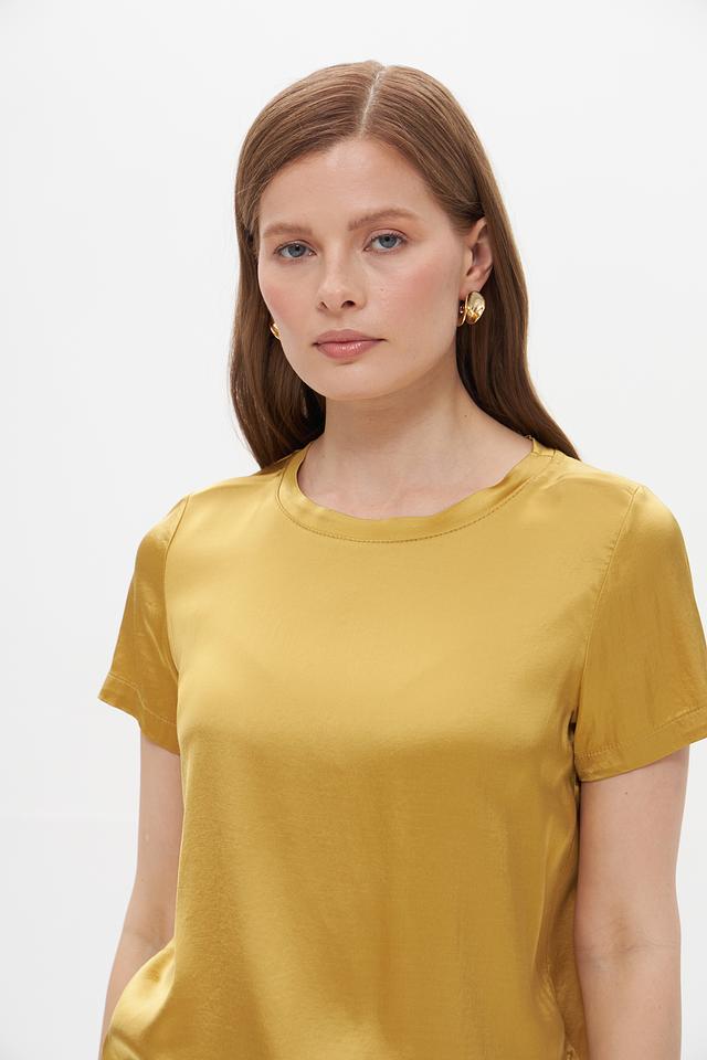 Блуза имеет классический крой с короткими рукавами и круглым вырезом горловины. Ее золотистый оттенок придает образу элегантность и изысканность. Сатиновый эффект ткани создает легкий блеск, который подчеркивает благородство изделия.