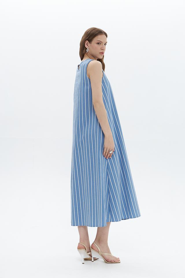 Это платье от Croche выполнено в лёгком и воздушном стиле, идеально подходящем для тёплой погоды. Преобладающий цвет – голубой, дополненный белыми вертикальными полосами, создающими визуально вытягивающий силуэт.