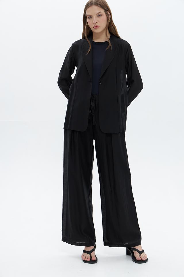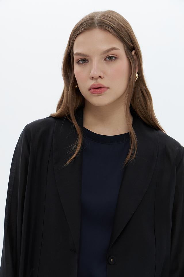 Жакет имеет оверсайз крой, который обеспечивает свободу движений и комфорт. Отложной воротник добавляет модели классический вид, а застёжка на одну пуговицу подчеркивает лаконичность дизайна.