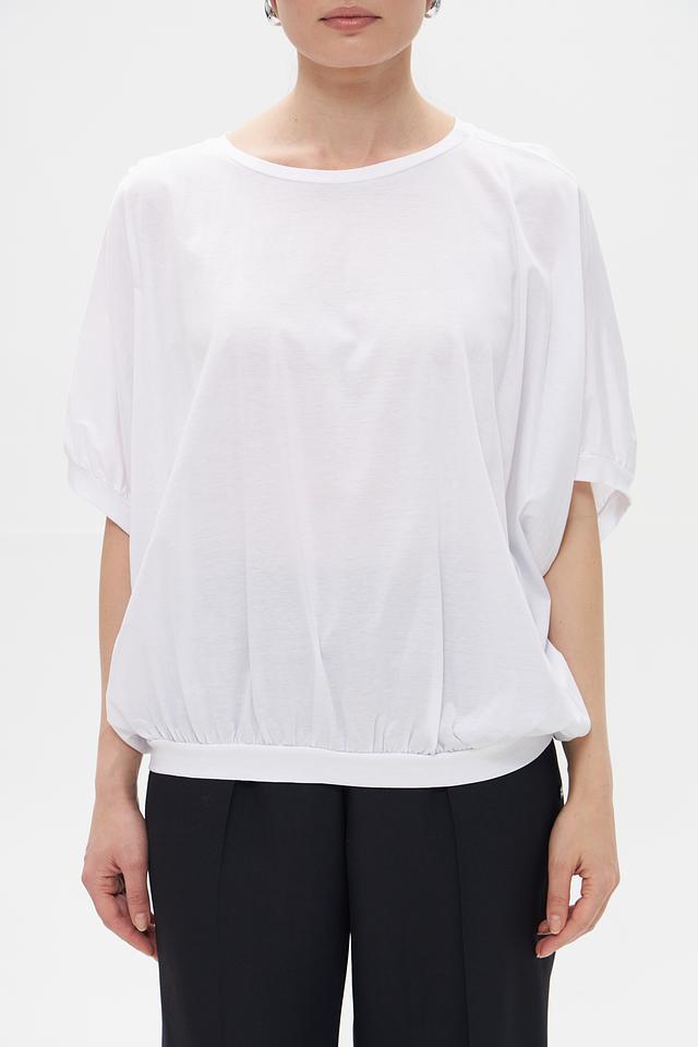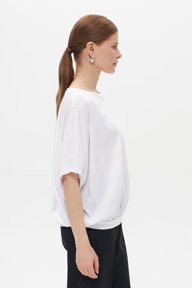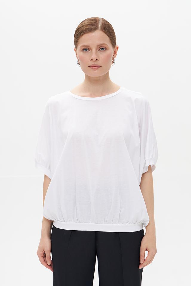 Футболка имеет свободный крой и короткий рукав-фонарик, который придает ей особый шарм и легкость. Округлый вырез горловины подчеркивает женственность силуэта. Минималистичный дизайн позволяет сочетать эту футболку с различными элементами одежды, создавая разнообразные образы.