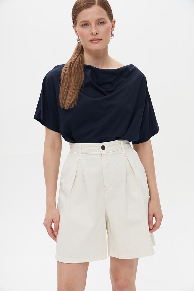 Модель имеет свободный крой, короткие рукава и округлый вырез горловины. Драпировка создает эффект асимметрии и добавляет изюминку в базовый гардероб.