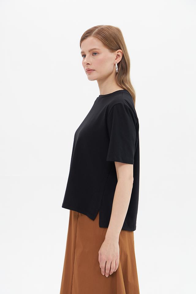 Особым акцентом являются небольшие разрезы по бокам, которые добавляют модели легкости и оригинальности. Эта футболка станет отличным дополнением к вашему базовому гардеробу и подойдет для повседневной носки. Состав: 95% хлопок, 5% эластан.