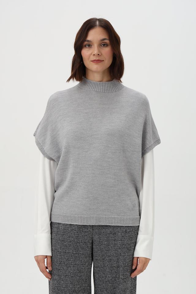 Жилет имеет прямой крой и высокий ворот, что придает ему элегантный вид. Изготовлен из мягкого трикотажа, обеспечивающего комфорт при носке. Модель без рукавов позволяет создавать многослойные образы.