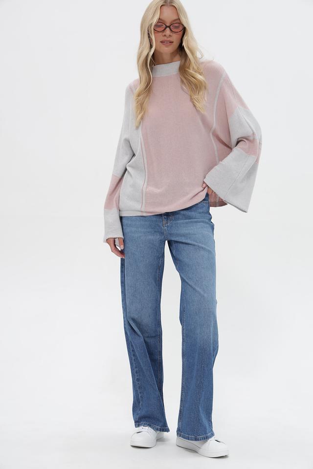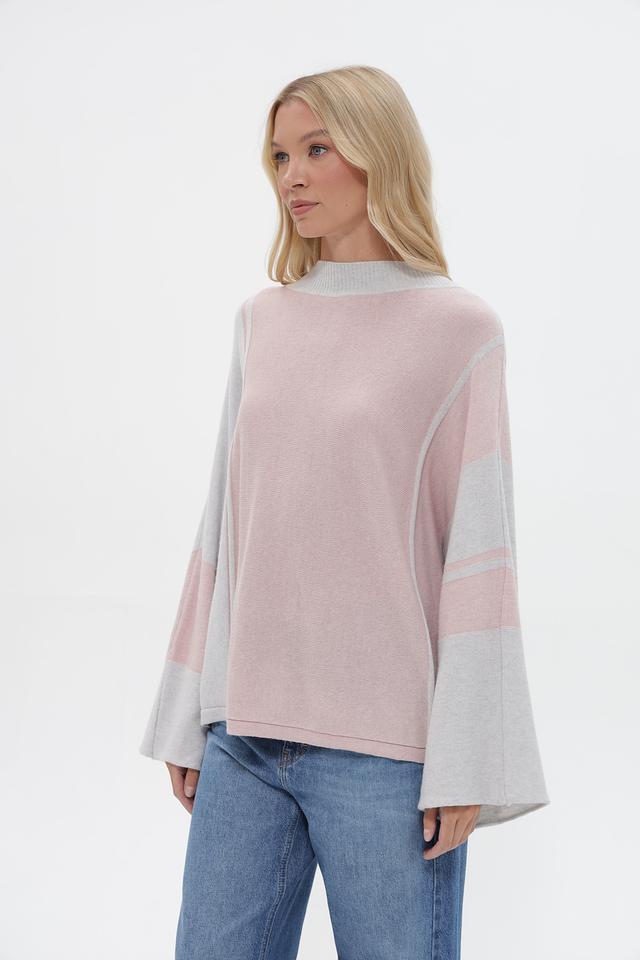 Женский пуловер Croche выполнен в актуальной технике колор-блока, сочетая нежные оттенки розового и серого. Модель имеет свободный крой, не сковывающий движений, и высокий воротник, добавляющий образу элегантности.