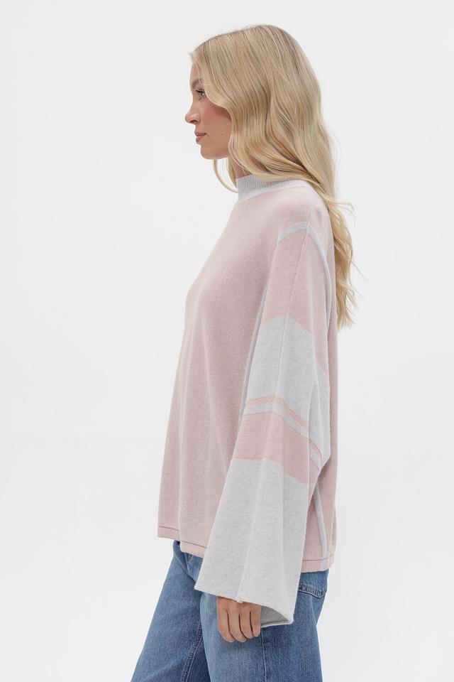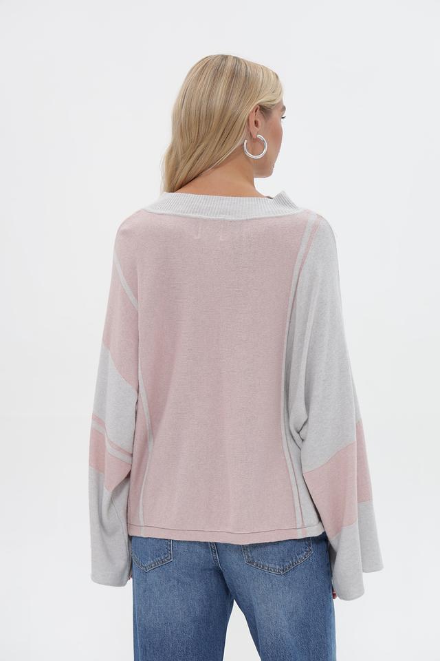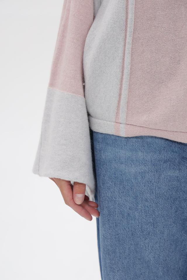Розовый пуловер Croche с контрастными вставками серого цвета и расклешенными рукавами. Изготовлен из мягкой смеси вискозы, шерсти и кашемира для комфорта и тепла. Состав: вискоза 30%, шерсть 30%, полиамид 30%, кашемир 10%