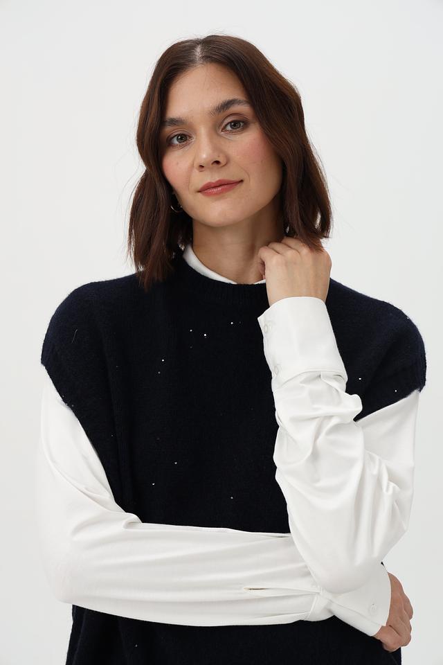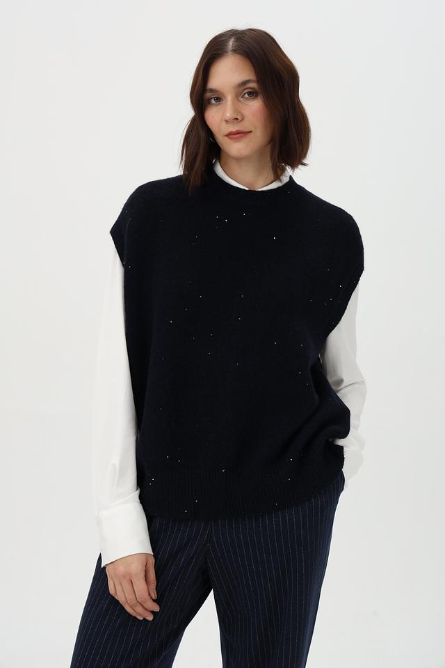 Жилет имеет свободный крой и округлый вырез, что обеспечивает комфортную посадку по фигуре. Декоративная вышивка в виде мелких точек добавляет изделию изысканности и оригинальности.