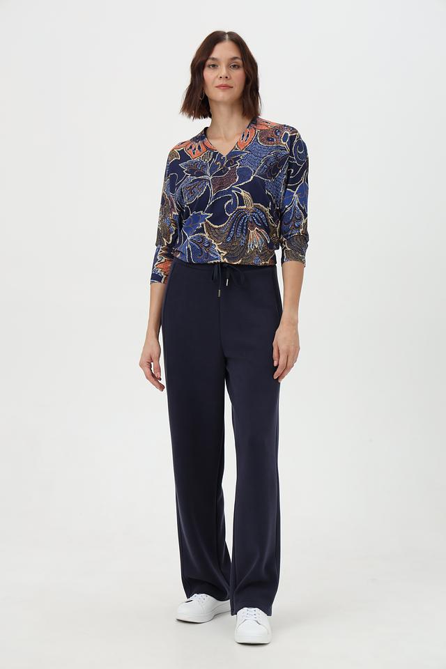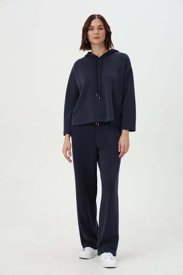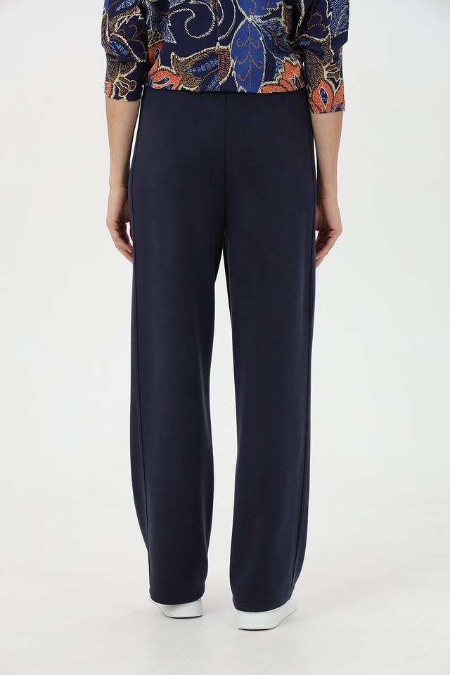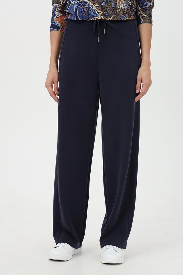 Темно-синие брюки Croche с завязками на поясе — отличный выбор для создания комфортного и стильного образа. Модель выполнена из мягкой ткани, сочетающей в себе вискозу, полиэстер и эластан. Состав: полиэстер 49%, вискоза 44%, эластан 7%