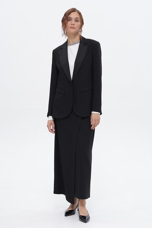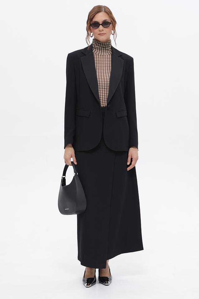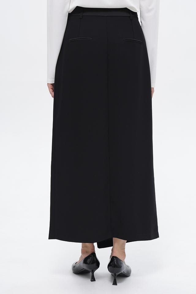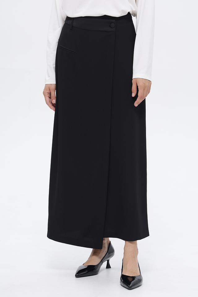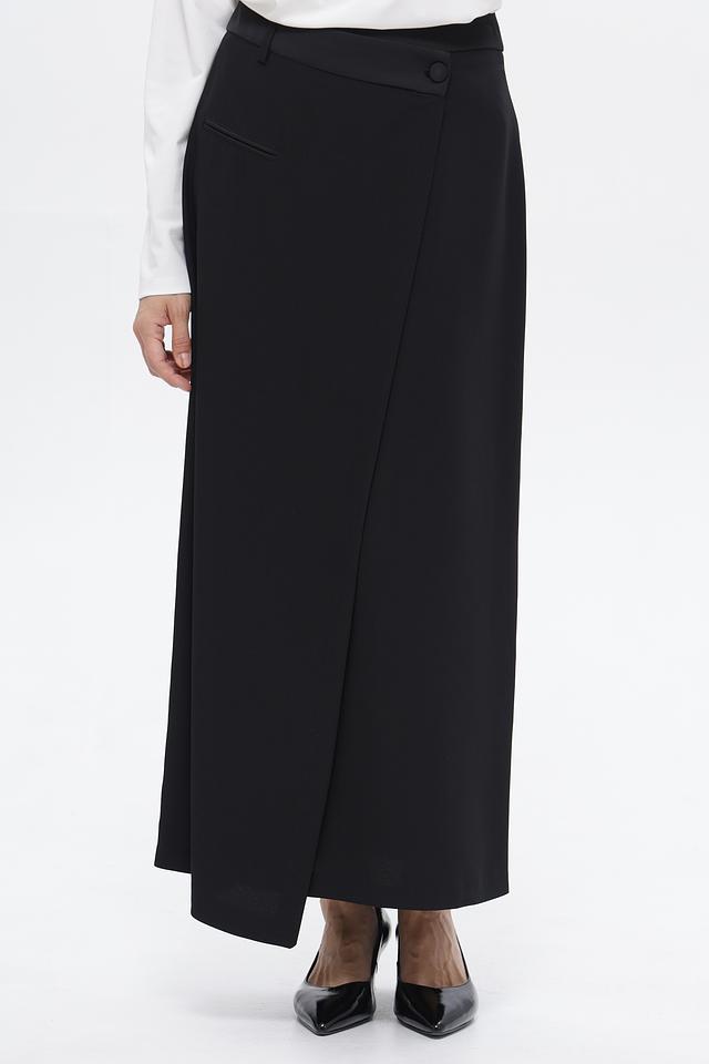 Классическая юбка от бренда Croche, выполненная в черном цвете. Модель имеет длину миди и асимметричный крой с запахом, который подчеркивает фигуру.