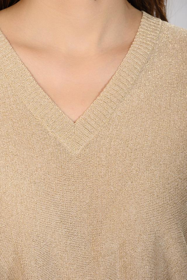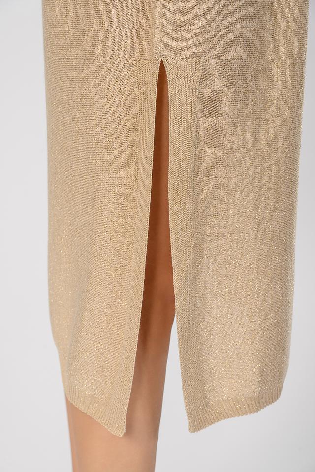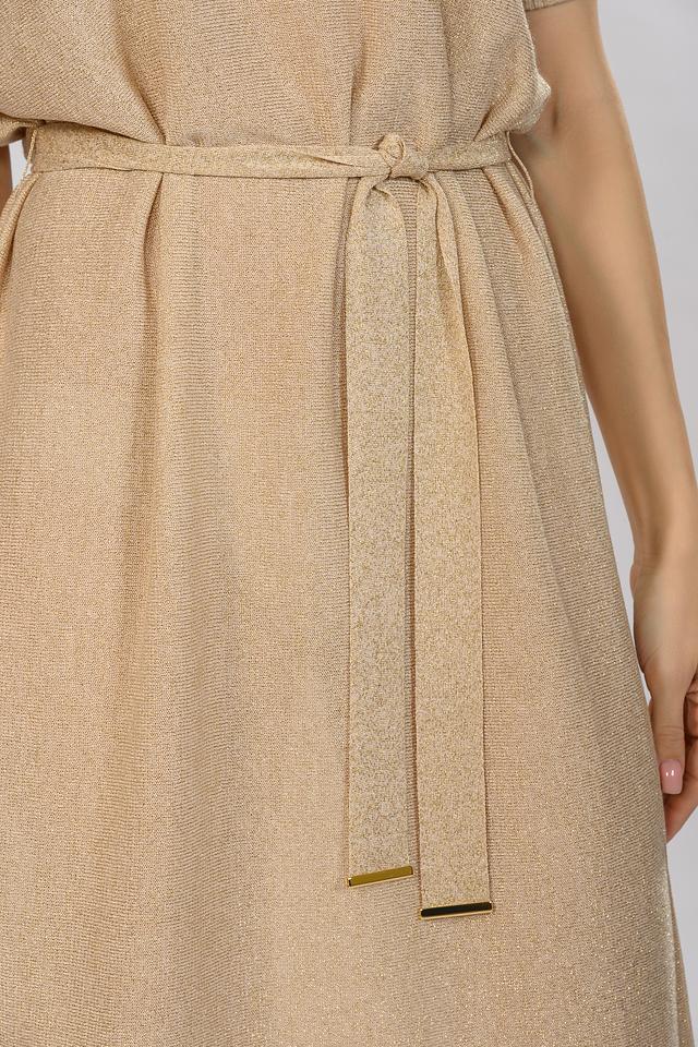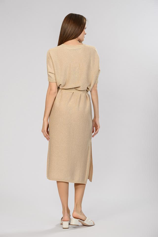 Бежевое платье от D. Exterior выполнено из мягкого вязаного полотна с добавлением блестящей нити. Модель имеет V-образный вырез, короткие рукава и пояс, подчеркивающий талию, а также стильный разрез сзади. Состав: вискоза 75%, полиэстер 14%, полиамид 11%