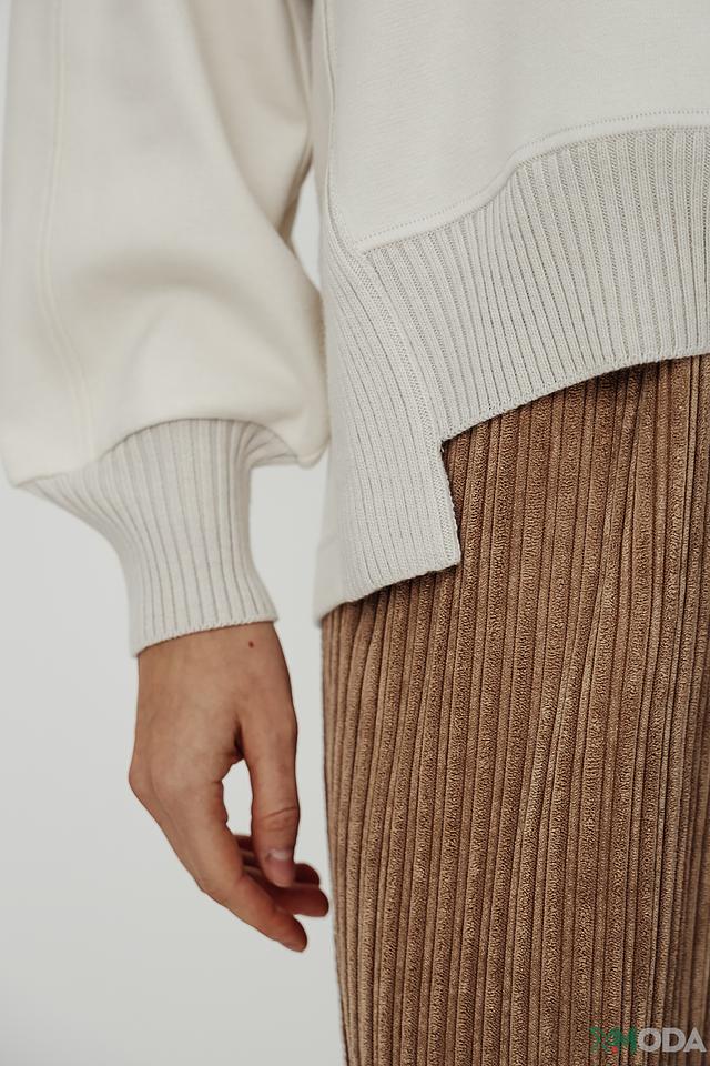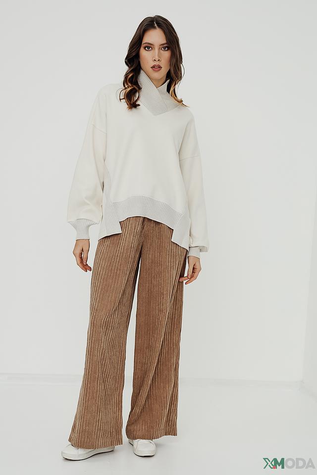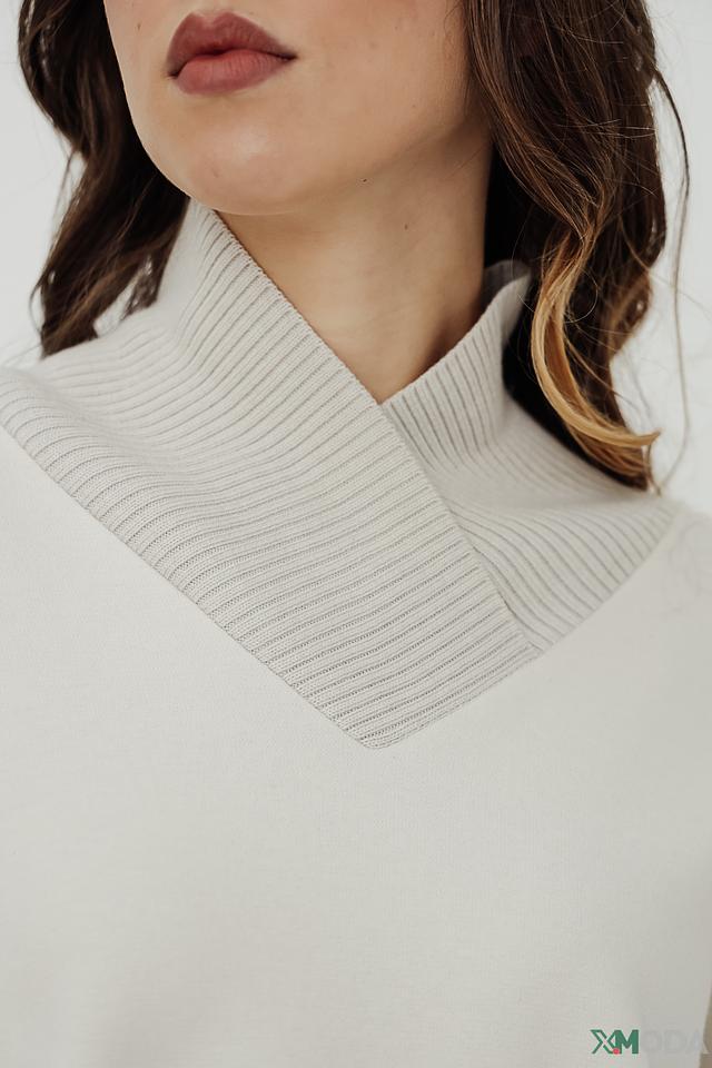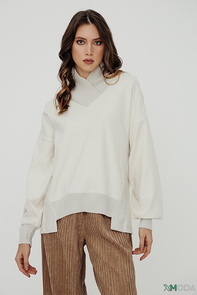 Особенностью модели является воротник-стойка, выполненный из фактурной вязки, который добавляет изысканности. Рукава-фонарики придают джемперу романтичный и женственный вид. Свободный крой обеспечивает комфорт в носке.