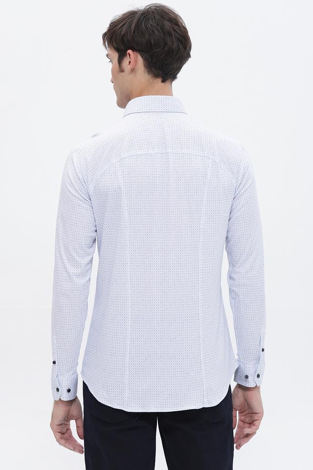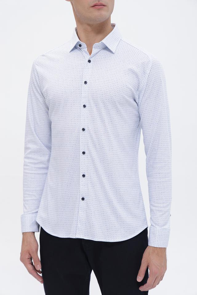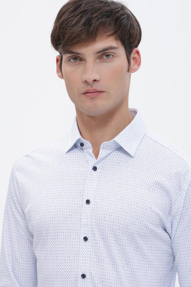 Рубашка имеет классический крой, подходящий для различных случаев – от деловых встреч до повседневной носки. Голубой цвет с мелким геометрическим принтом придает ей стильный и современный вид.