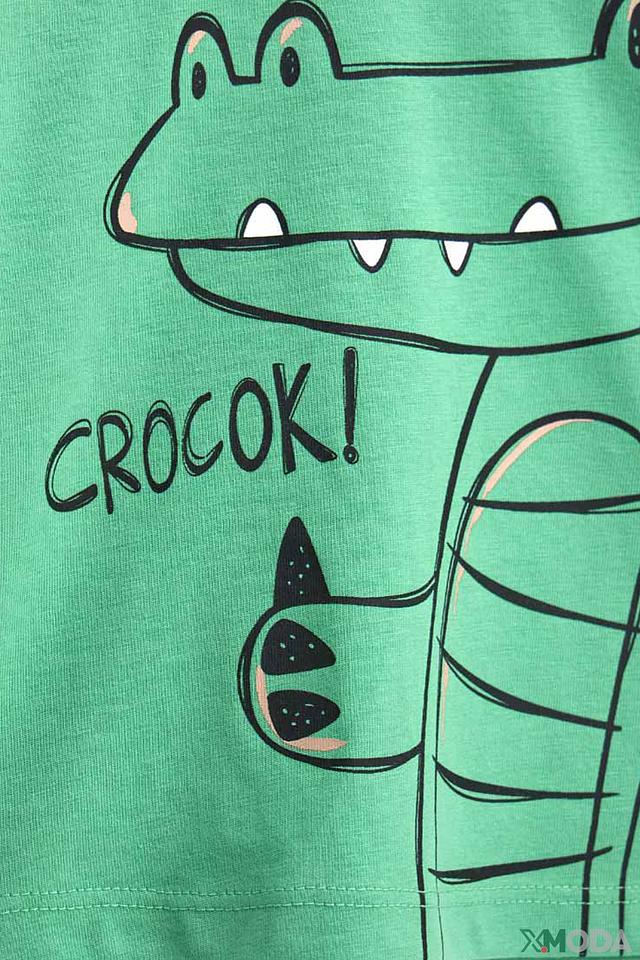 На передней части футболки изображен забавный крокодил с надписью "CROCOK!". Принт выполнен в чёрно-белой гамме, что создаёт контрастный и привлекательный вид. Футболка имеет круглый вырез горловины и короткие рукава.