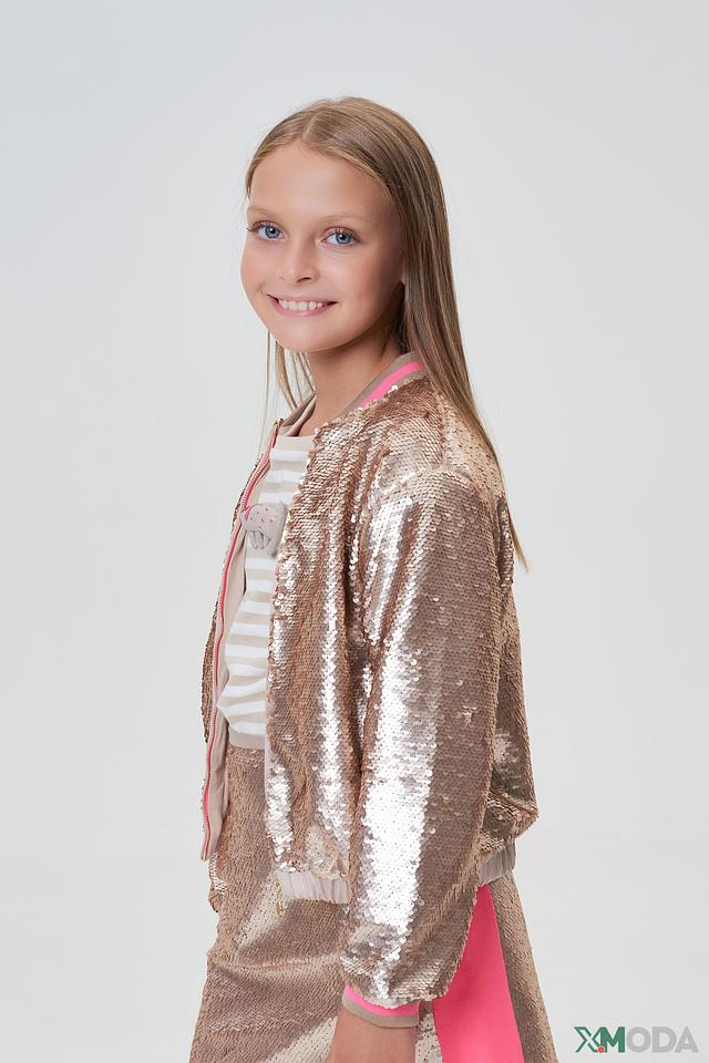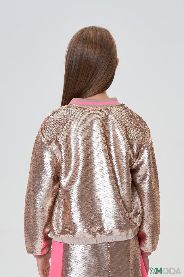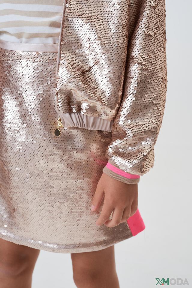 Представляем стильную куртку-бомбер от бренда Choupette, которая станет ярким акцентом в детском гардеробе. Эта модель выполнена в золотистом цвете и полностью покрыта мерцающими пайетками, создающими праздничное настроение.