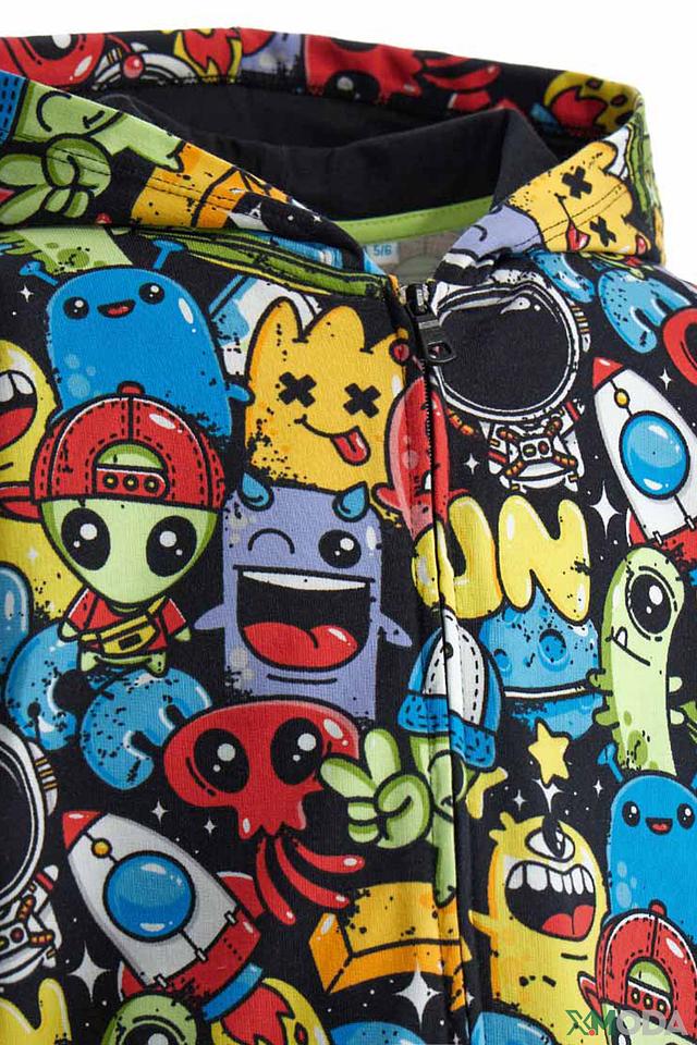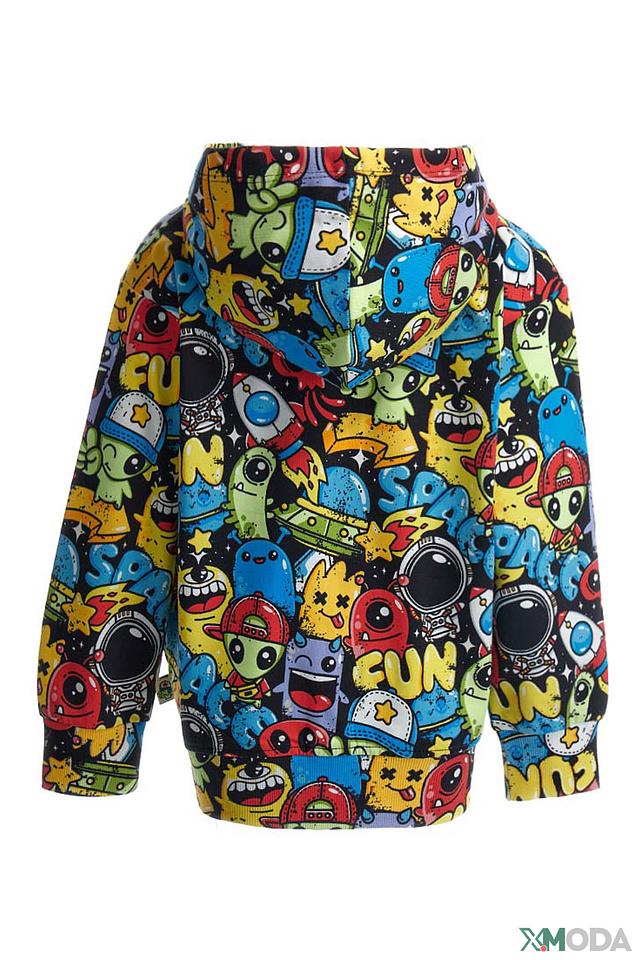 Толстовка имеет удобную застежку-молнию, капюшон и длинные рукава. Главная особенность – оригинальный принт с изображением забавных космических персонажей, ракет и планет, который обязательно понравится юным исследователям космоса.
