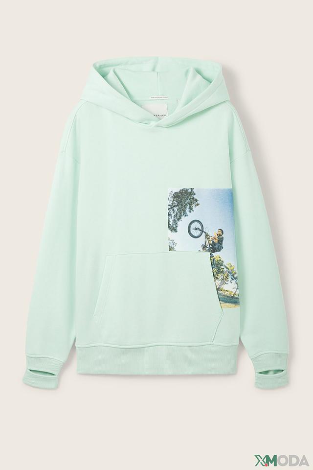 Свитшот имеет мятный цвет и украшен ярким принтом с изображением пейзажа и мотоцикла. Модель дополнена капюшоном и удобным карманом-кенгуру. Необычные разрезы на рукавах придают образу оригинальность.