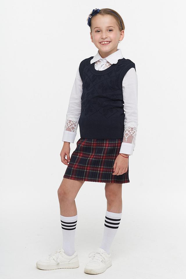 Синий жилет от VAY для девочки, выполнен из мягкого трикотажа с классическим ромбовидным узором. Идеально дополнит школьный гардероб или повседневный образ, обеспечивая комфорт и тепло. Состав: хлопок 50%, акрил 50%
