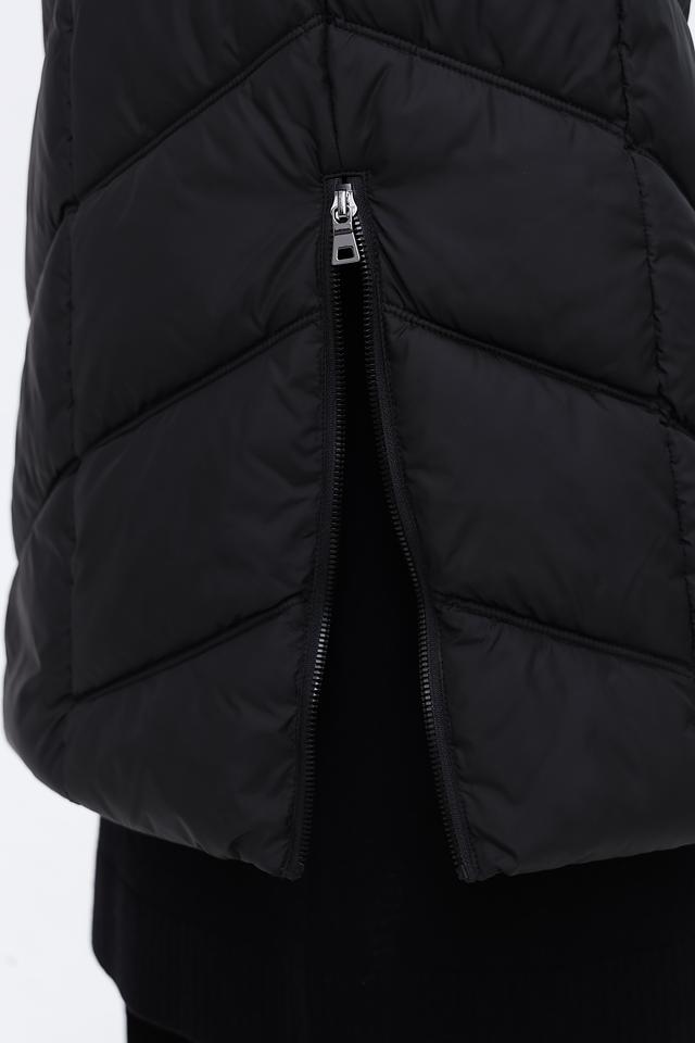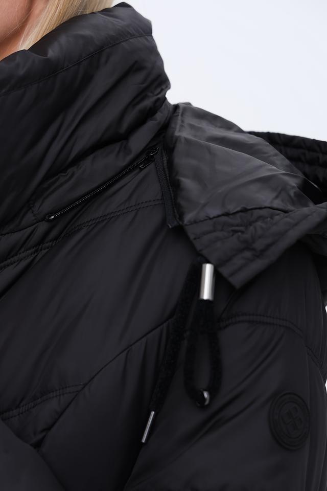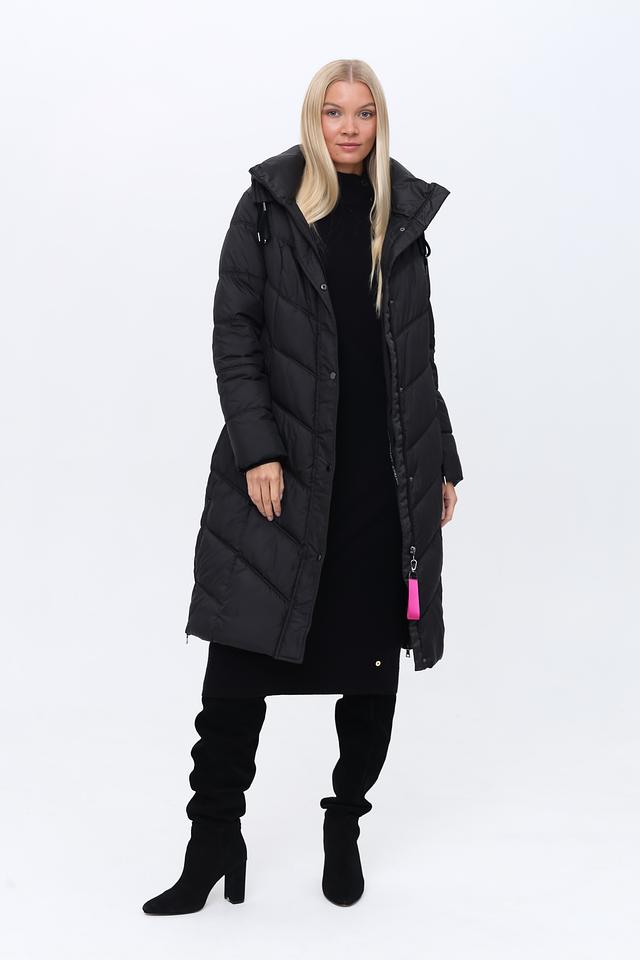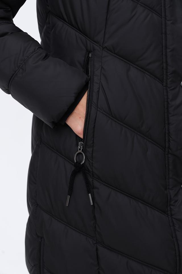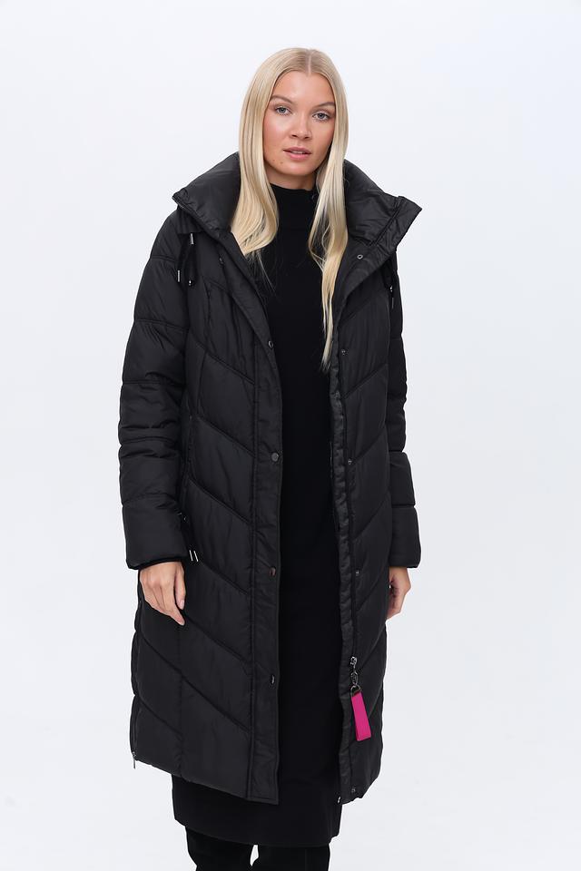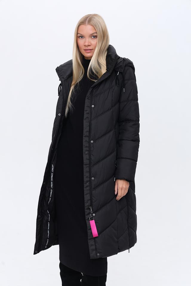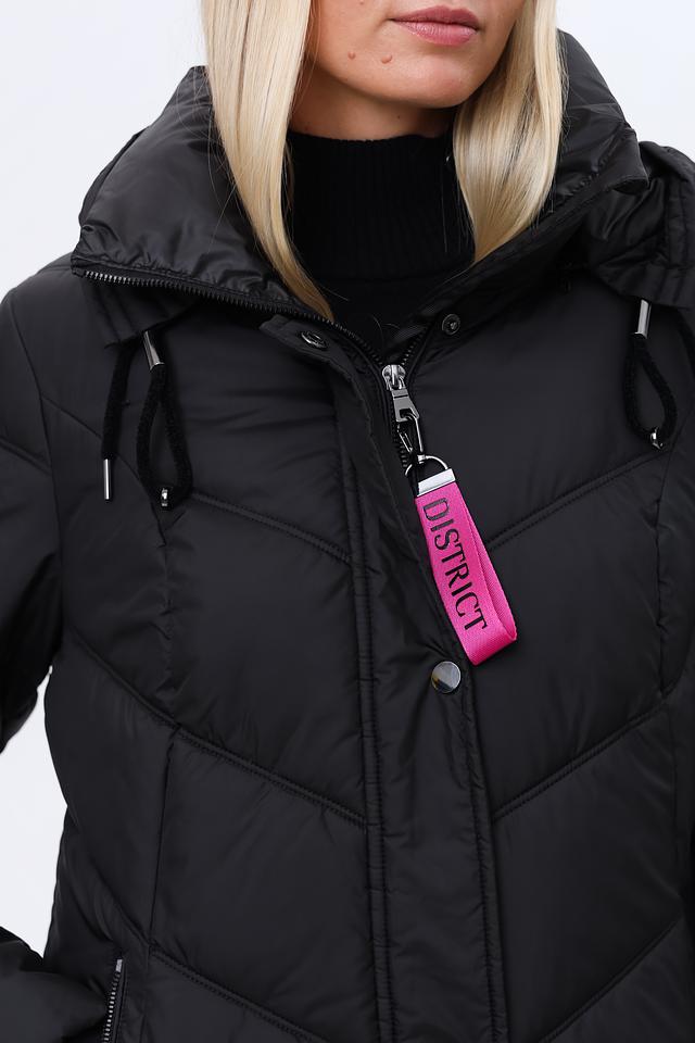 Чёрное стеганое пальто District – это стильная и теплая верхняя одежда для прохладной погоды. Модель имеет удобный капюшон, застежку на молнию и боковые карманы, а также яркую розовую петлю. Состав: полиэстер 100%