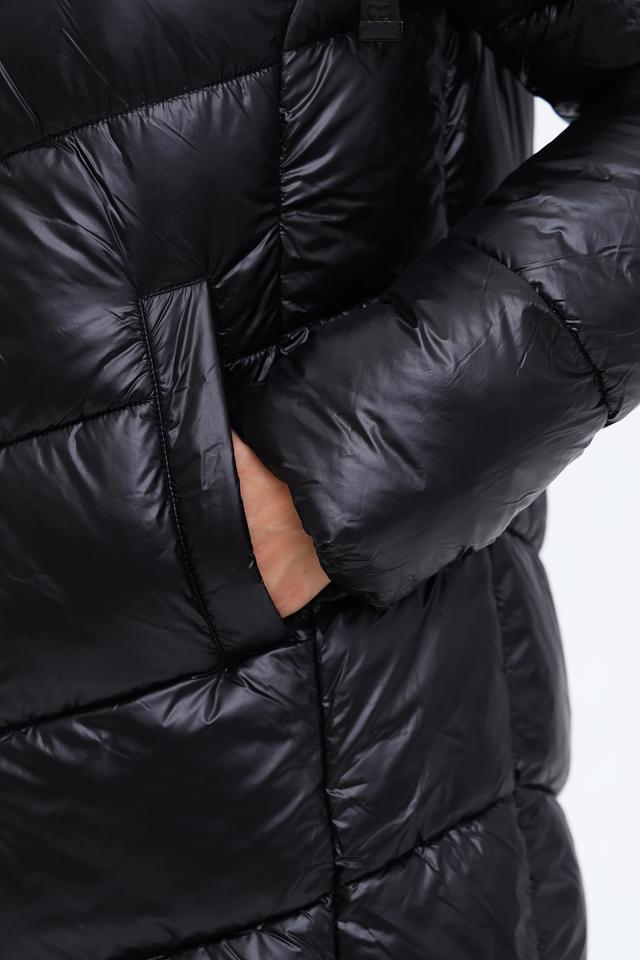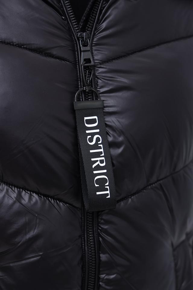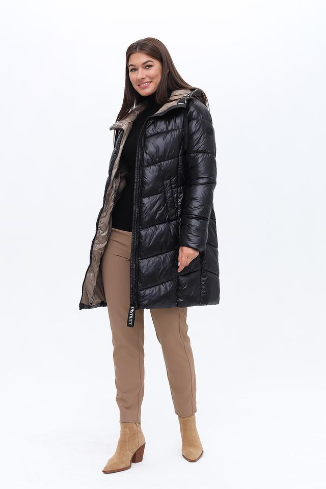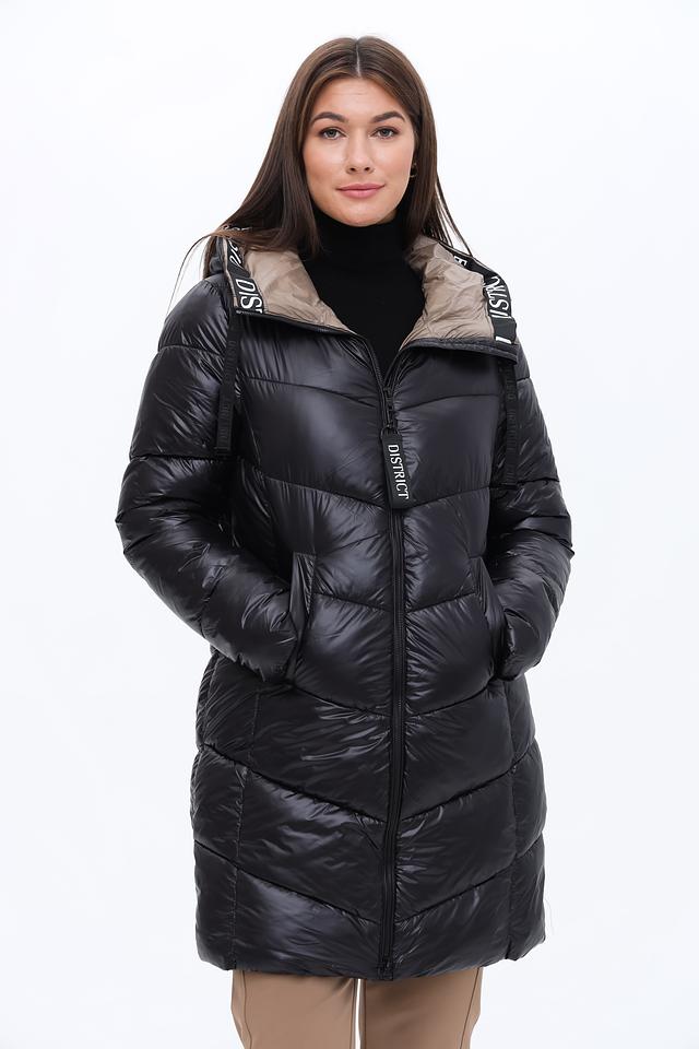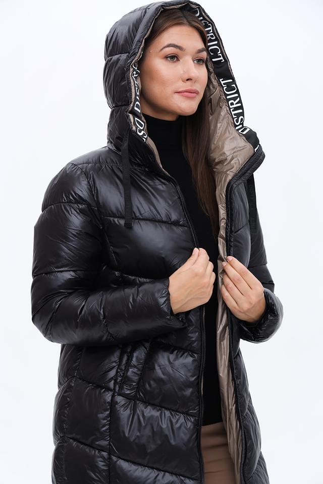 Стильное пальто District выполнено в чёрно-бежевой гамме и имеет стеганую фактуру. Модель с капюшоном и удобной застежкой-молнией станет отличным выбором для прохладной погоды. Состав: полиамид 100%