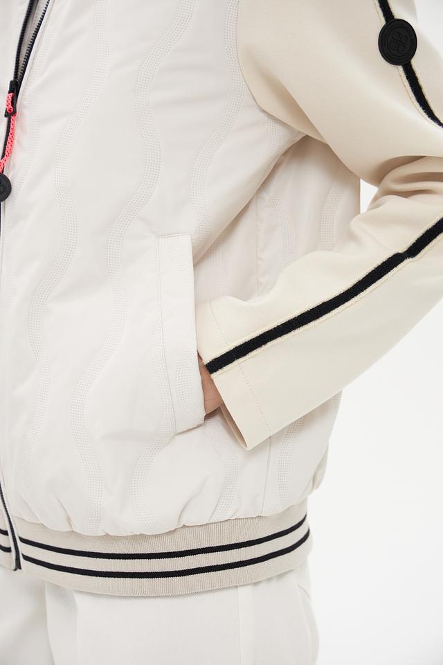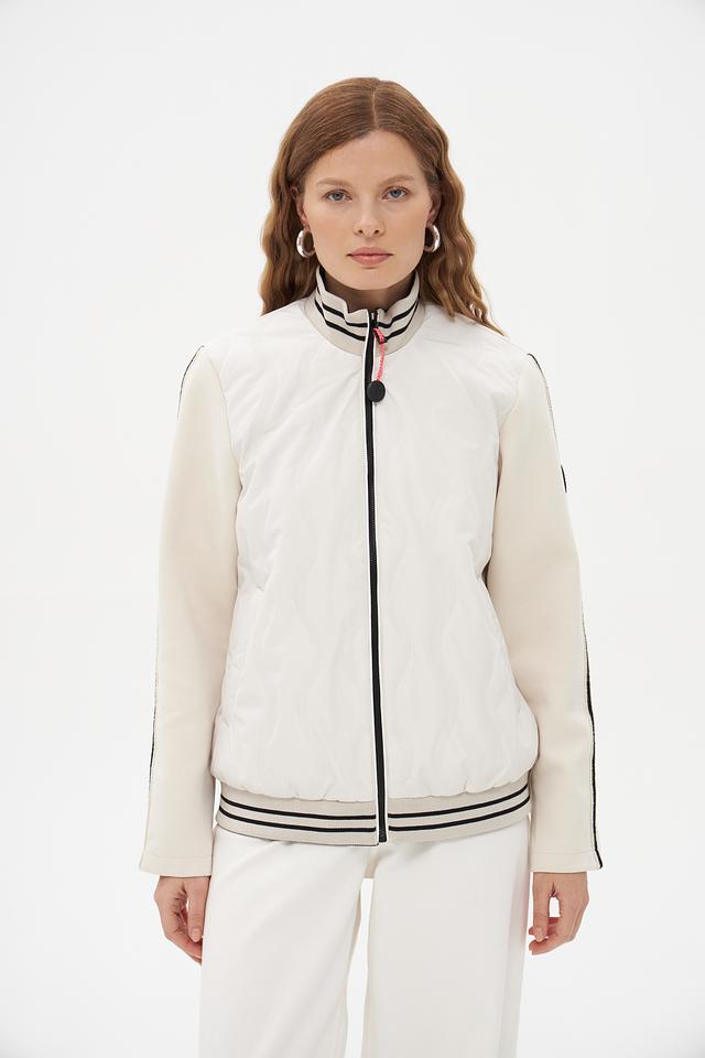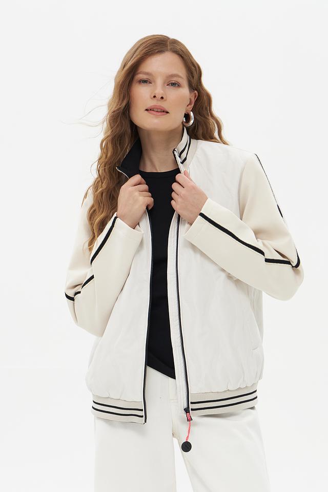 Белая куртка District с чёрными полосками – стильная и удобная модель для повседневной носки. Куртка выполнена из полиэстера, имеет застёжку-молнию и воротник-стойку. Состав: полиэстер 100%
