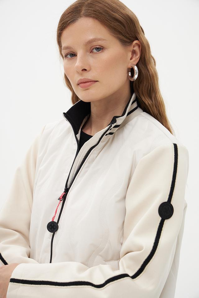 Эта куртка от бренда District станет отличным дополнением к вашему гардеробу. Выполнена в белом цвете с контрастными чёрными полосками на рукавах и по низу изделия, что придает ей спортивный и динамичный вид.