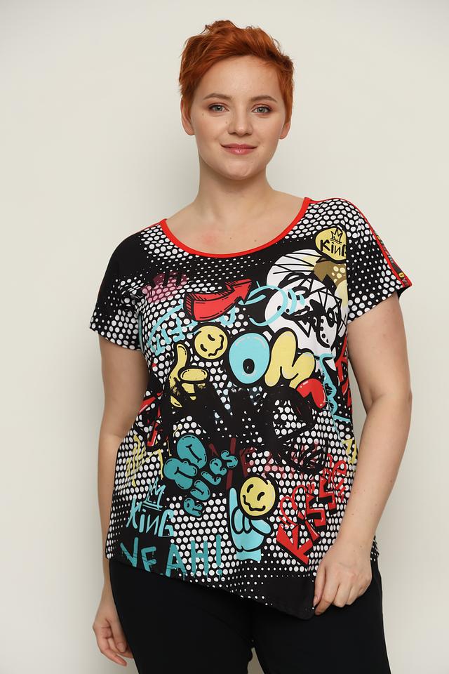 Женская футболка Doris Streich чёрного цвета с ярким принтом в стиле комиксов. Модель выполнена из мягкой вискозы с добавлением эластана, обеспечивающего комфортную посадку. Оригинальный дизайн и свободный крой делают эту футболку отличным выбором для повседневного образа. Состав: вискоза 92%, эластан 8%