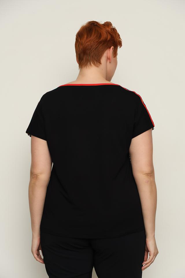 Особенности модели: короткий рукав, округлый вырез горловины, свободный крой. Отделка горловины и рукавов выполнена контрастной красной полосой. Футболка идеально подходит для создания непринужденных и стильных образов. Она легко сочетается с джинсами, брюками или юбками.