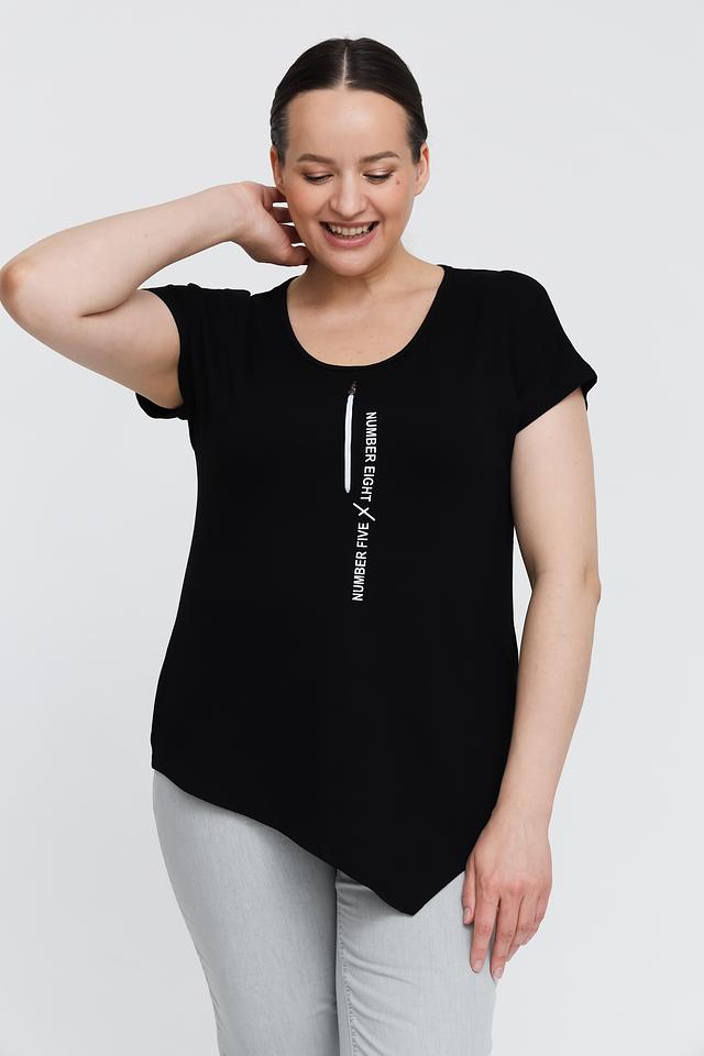 Чёрная футболка от Doris Streich с асимметричным низом и вертикальным принтом. Модель выполнена из мягкой вискозы с добавлением эластана для комфортной посадки. Состав: вискоза 96%, эластан 4%