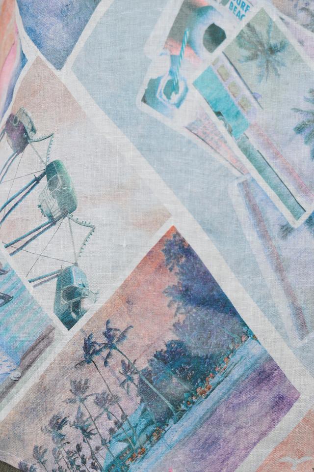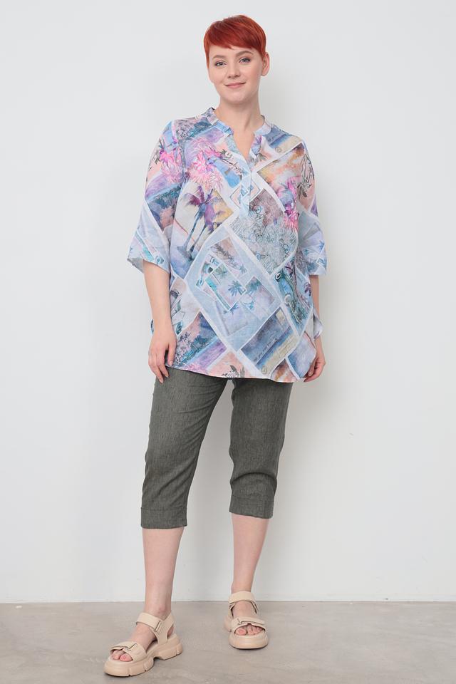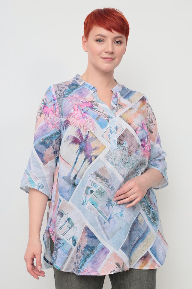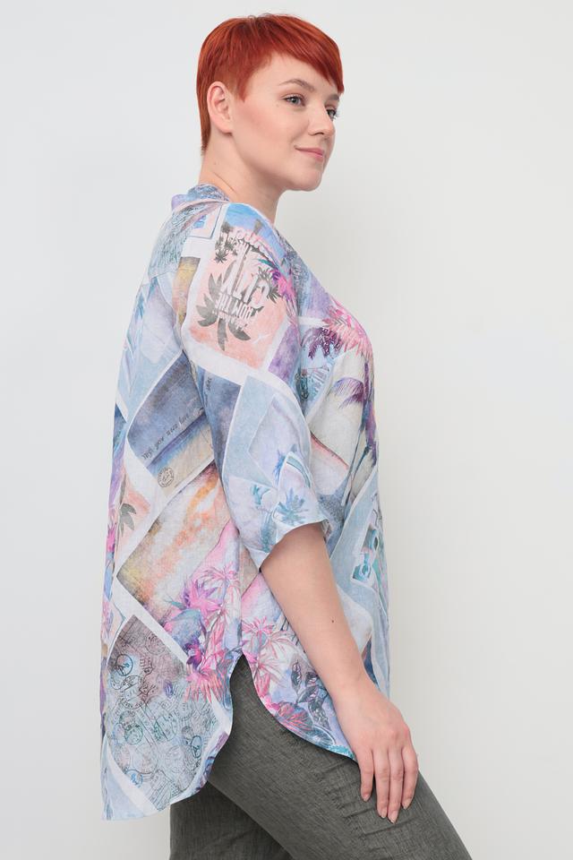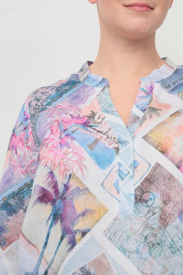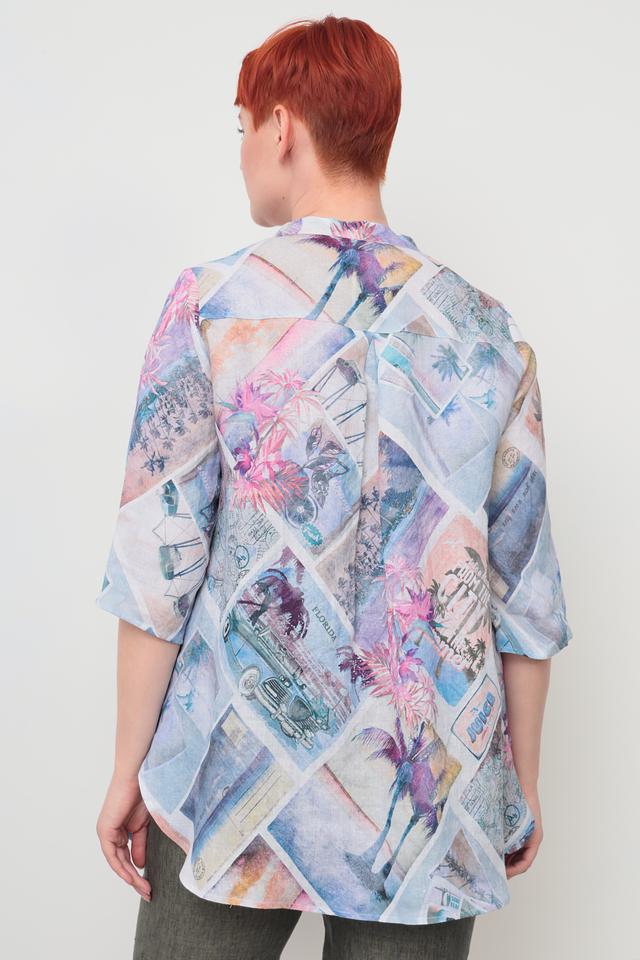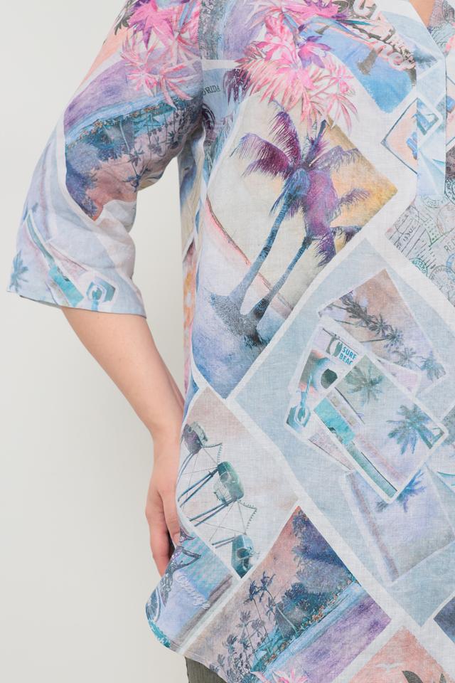 Блуза имеет свободный крой, который не сковывает движений и позволяет создать расслабленный образ. Короткий рукав 3/4 делает ее идеальным выбором для теплой погоды. Особенностью данной модели является яркий и оригинальный принт, выполненный в виде коллажа из различных изображений – пальм, морских пейзажей и винтажных открыток.
