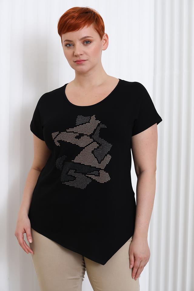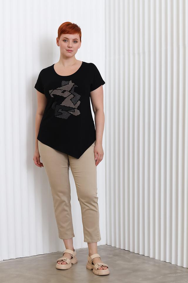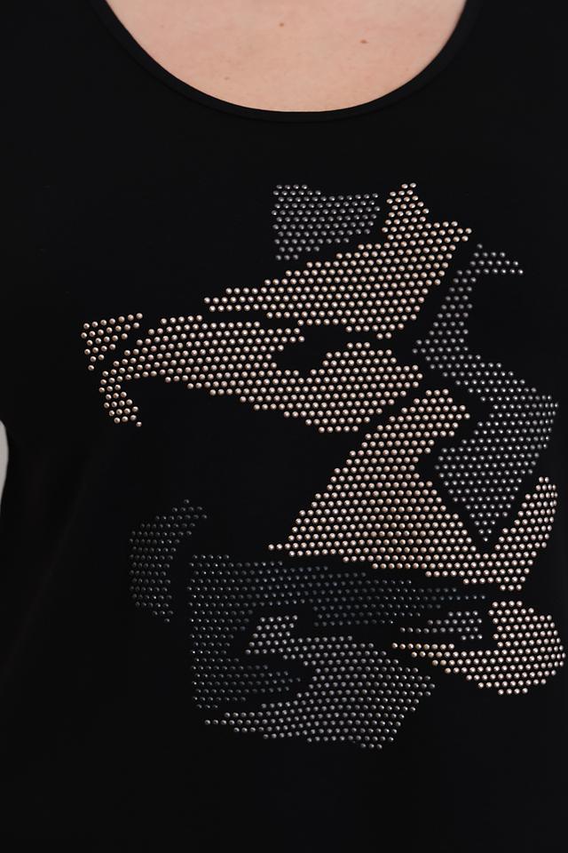 Основной цвет блузы – чёрный, который легко сочетается с другими элементами одежды. Главная особенность модели – эффектный принт, изображающий голову животного, выполненный с использованием мелких страз или глиттера, что придает изделию изысканность.