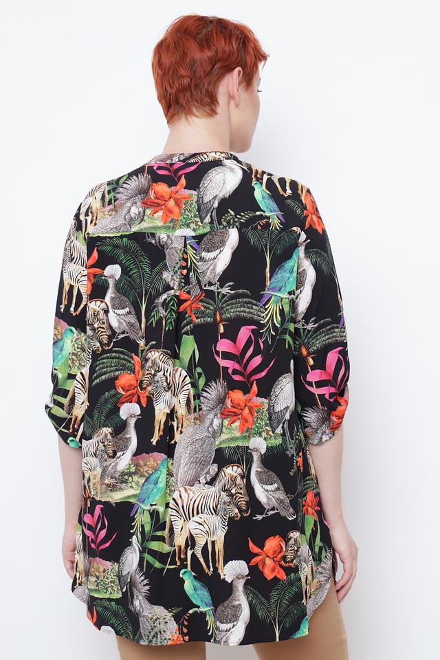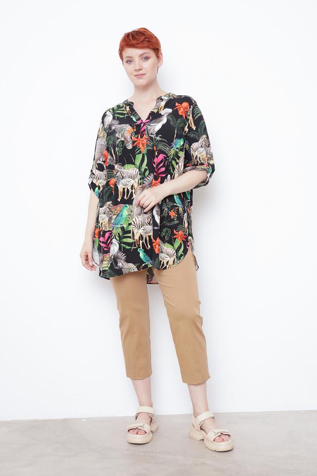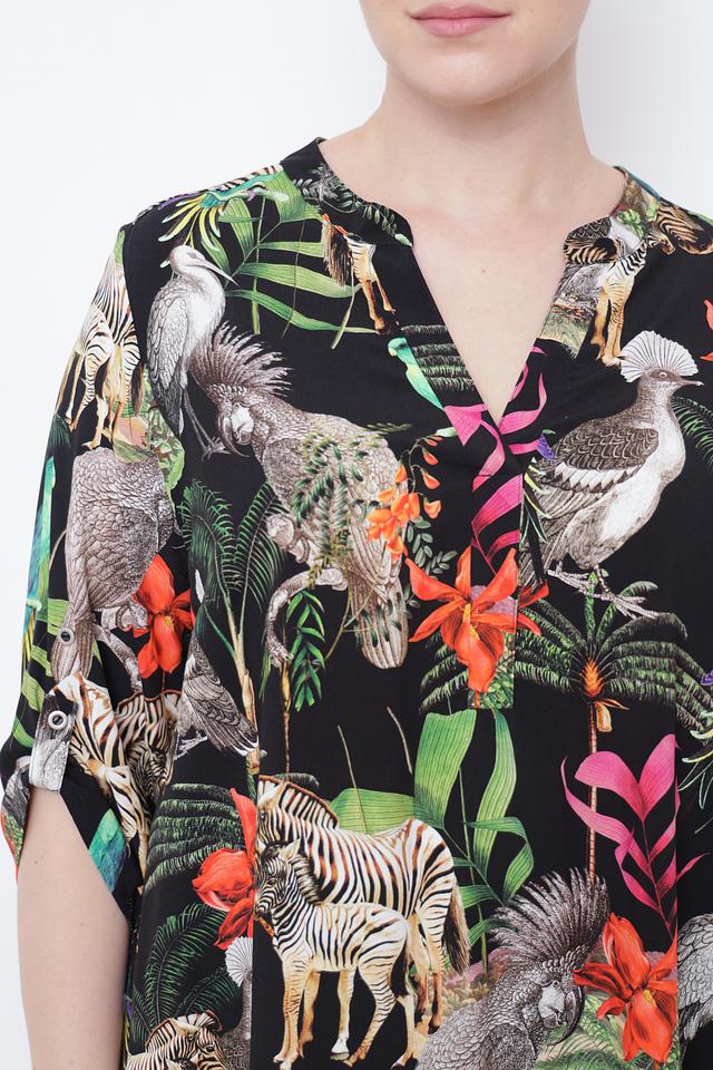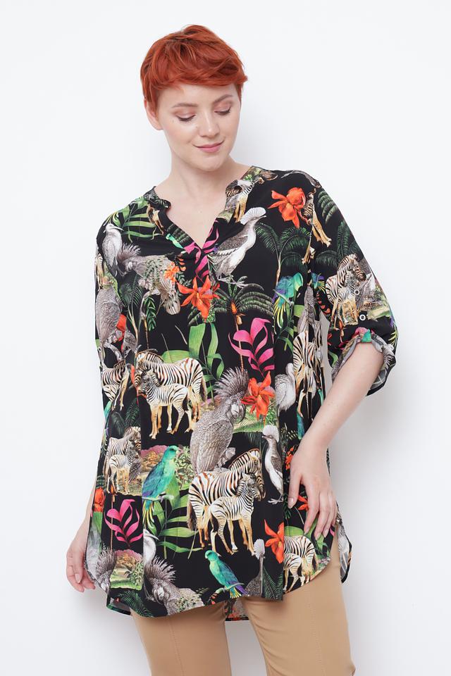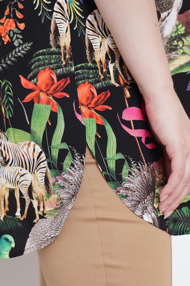 Основной цвет блузы – чёрный, который служит идеальным фоном для красочного принта "Сафари". На блузе изображены различные африканские животные, такие как зебры, жирафы, птицы и тропические растения, выполненные в ярких и насыщенных цветах.