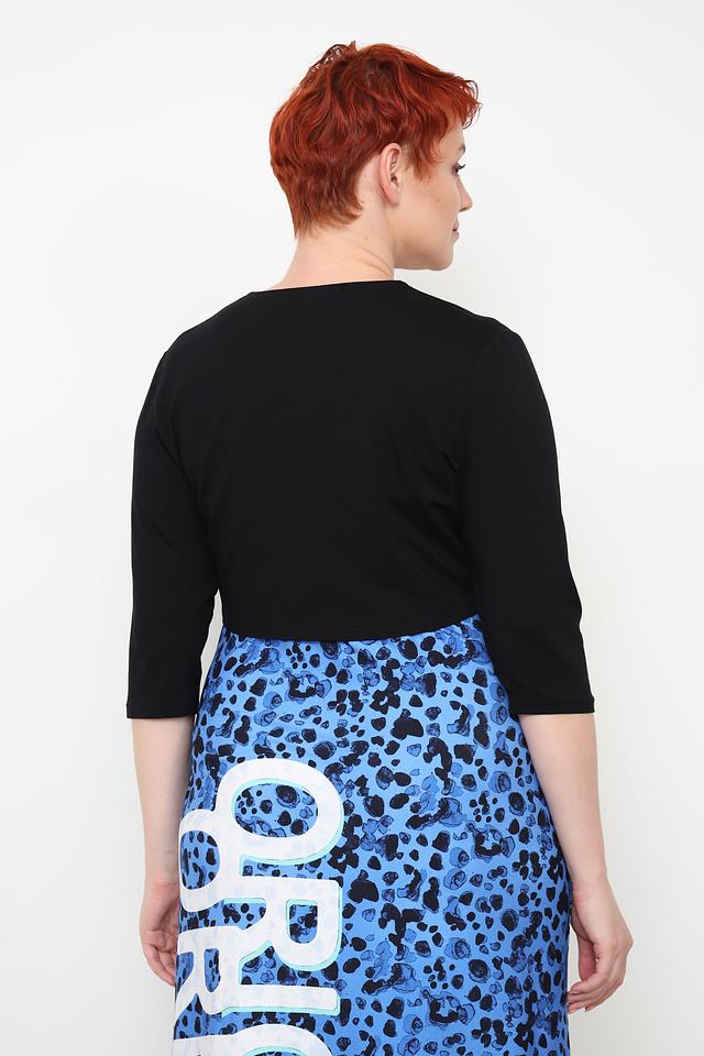 Жакет имеет короткий рукав 3/4 и V-образный вырез. Оригинальным элементом дизайна являются завязки спереди, которые позволяют регулировать силуэт и создавать различные образы. Завязки можно завязать бантиком или оставить свободно свисающими.