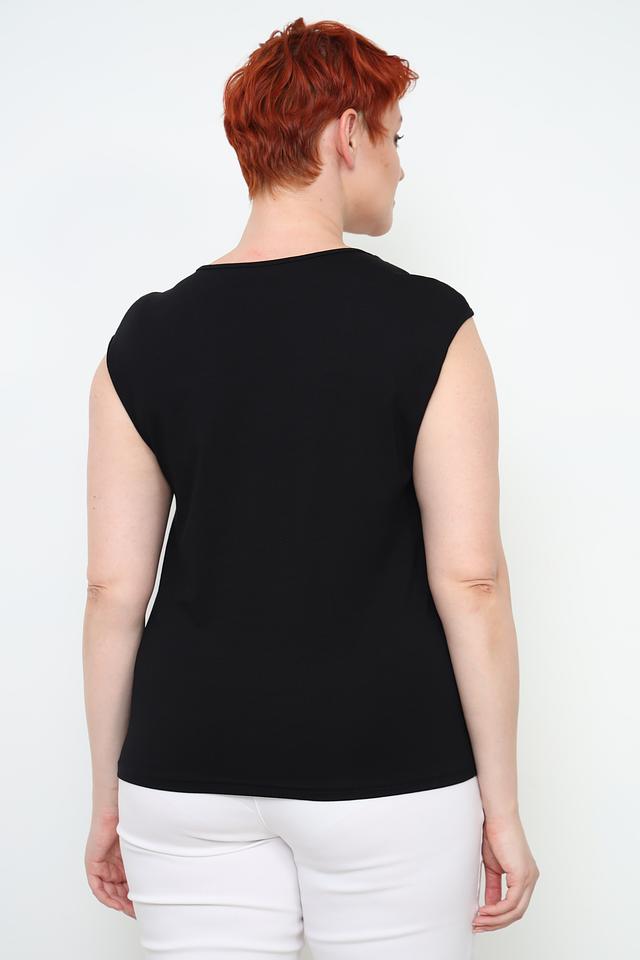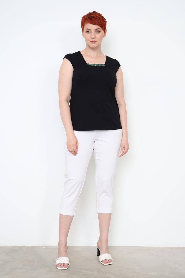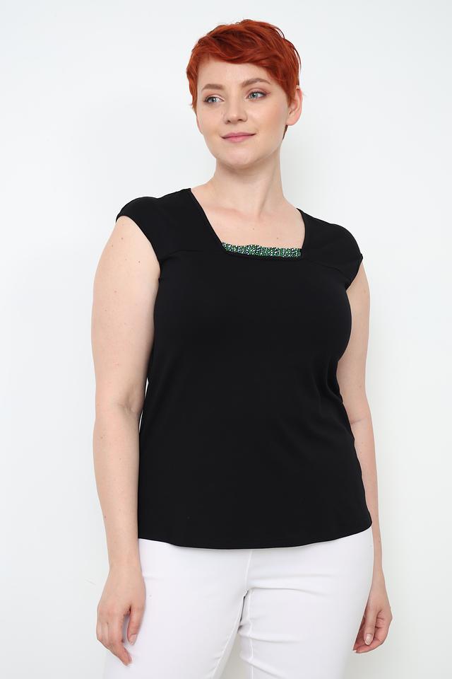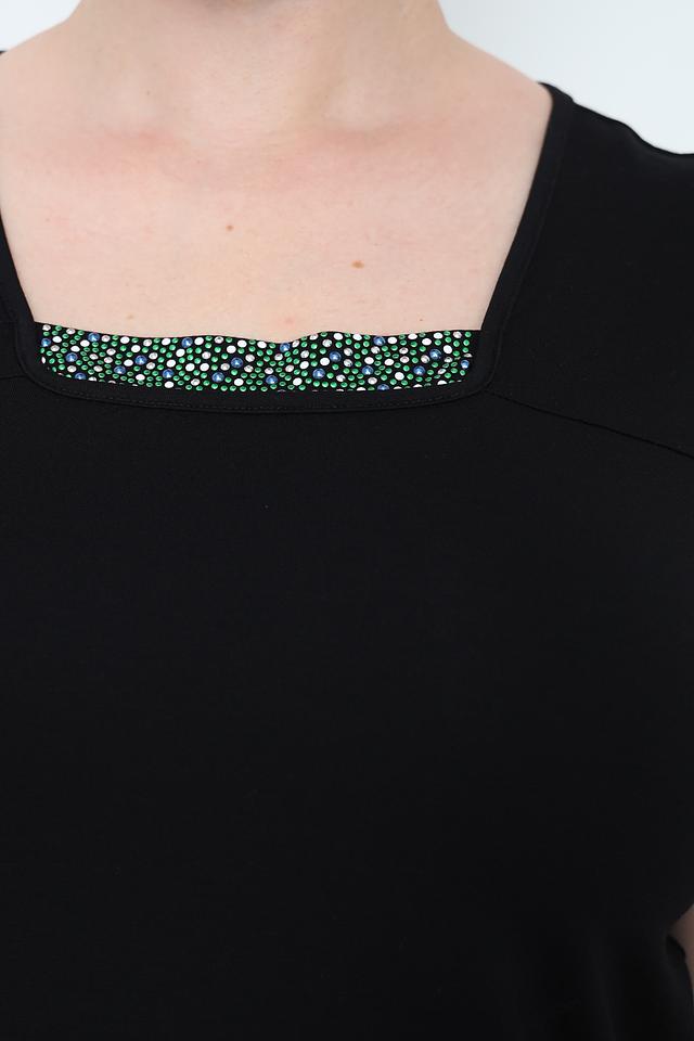 Модель имеет круглый вырез горловины, который украшен декоративной отделкой из страз, придающей изделию изысканность и блеск. Короткие рукава делают топ идеальным для тёплой погоды.