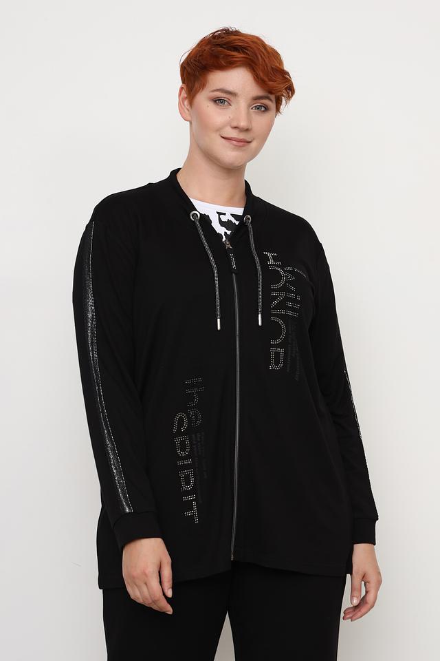 Кардиган имеет удобную застёжку на молнии, капюшон со шнурками и длинные рукава. Декоративные элементы в виде надписей и полос с блестящей нитью придают изделию современный и стильный вид.