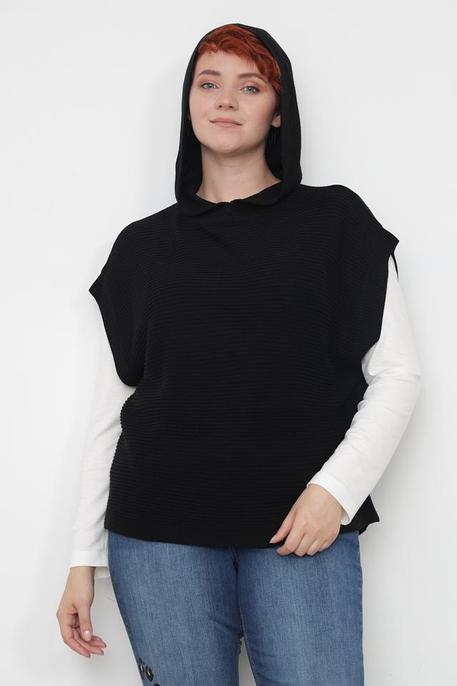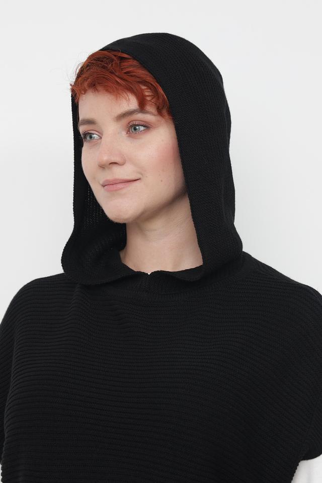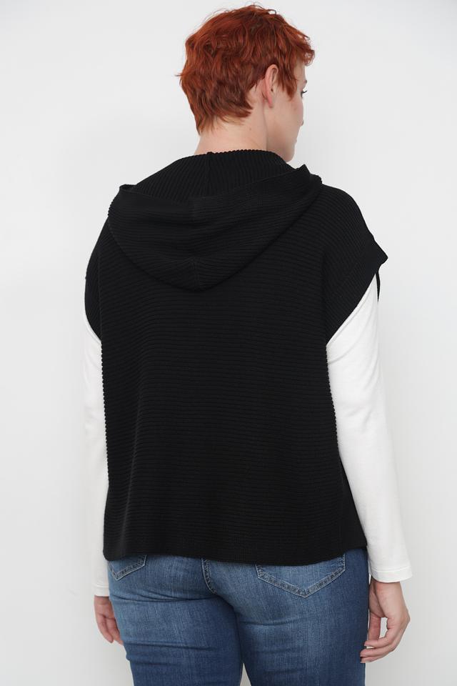 Жилет имеет свободный крой, что обеспечивает комфорт и свободу движений. Капюшон добавляет функциональности и позволяет защититься от ветра или небольшого дождя. Фактурный трикотаж придает изделию особый шарм и делает его более интересным.