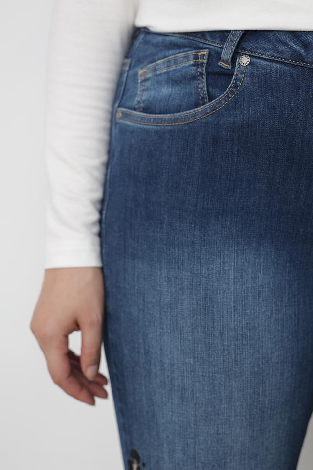 Джинсы имеют высокую посадку, которая визуально удлиняет ноги и подчеркивает талию. Зауженный к низу крой (skinny) обеспечивает комфортную посадку и позволяет сочетать их с различной обувью – от кед до ботильонов.
