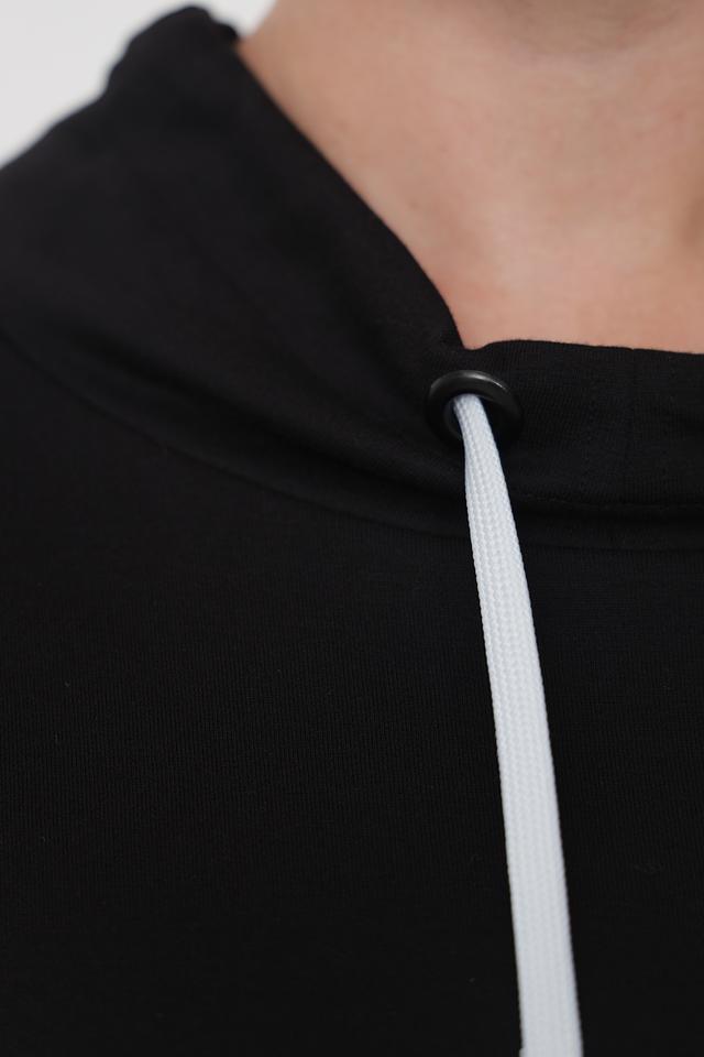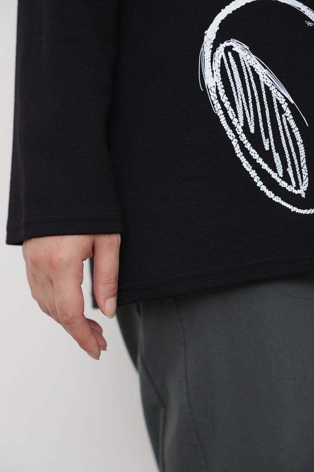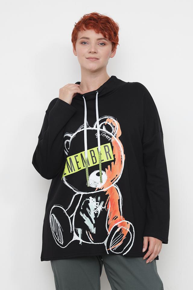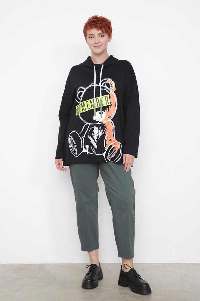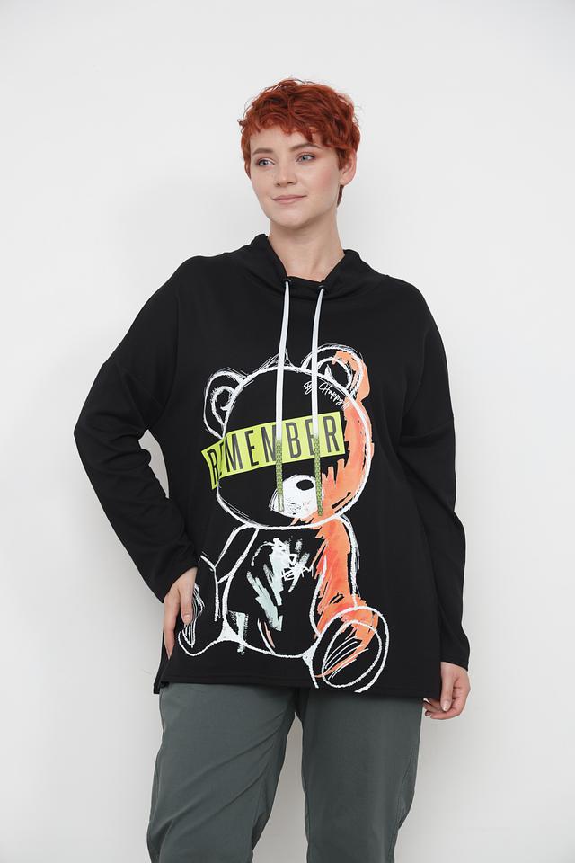 Чёрный пуловер от Doris Streich с оригинальным принтом медведя. Модель выполнена из мягкого и приятного к телу сочетания хлопка и модала, дополнена капюшоном и шнурком для регулировки. Состав: хлопок 49%, модал 49%, эластан 2%