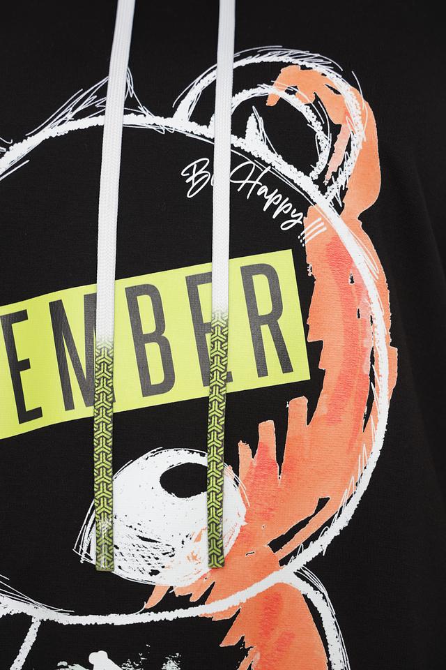 Пуловер имеет свободный крой, длинные рукава и удобный капюшон. Главная особенность модели – крупный принт медведя в графичном стиле, выполненный в сочетании чёрного, оранжевого и белого цветов. Шнурок на капюшоне позволяет регулировать степень защиты от ветра и создавать разные образы.