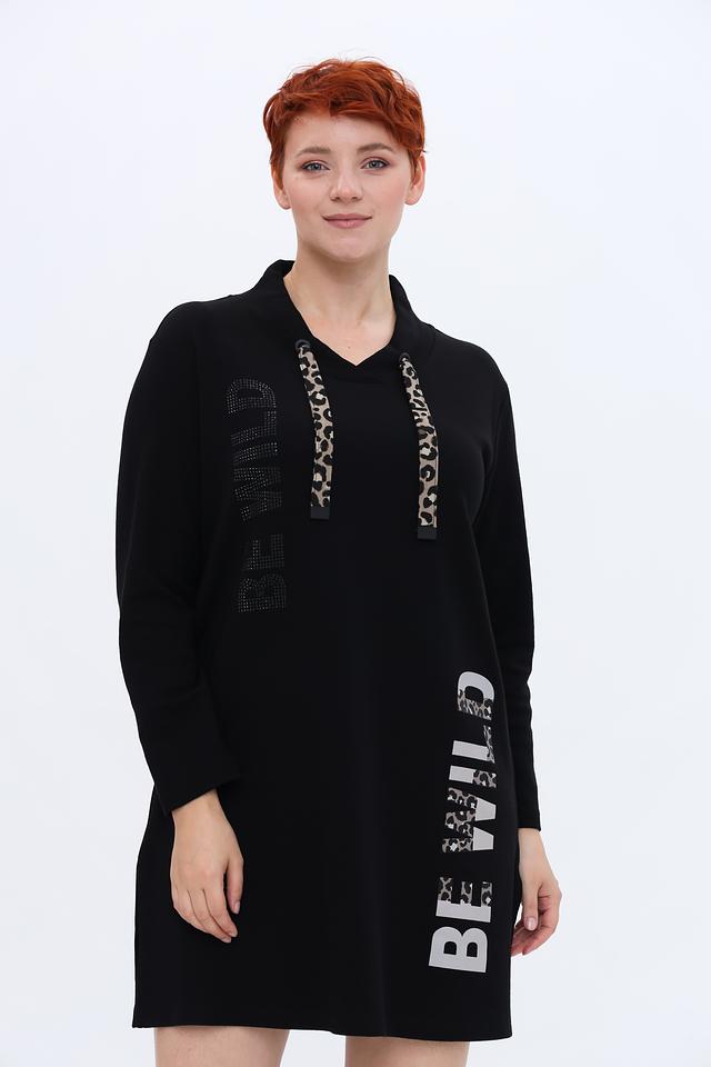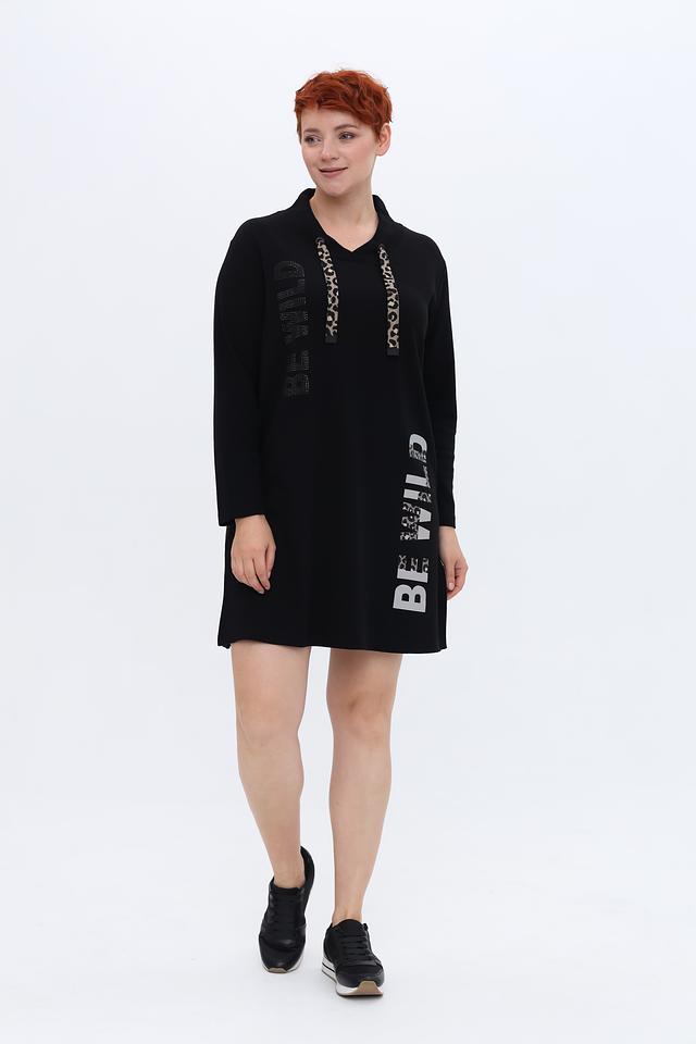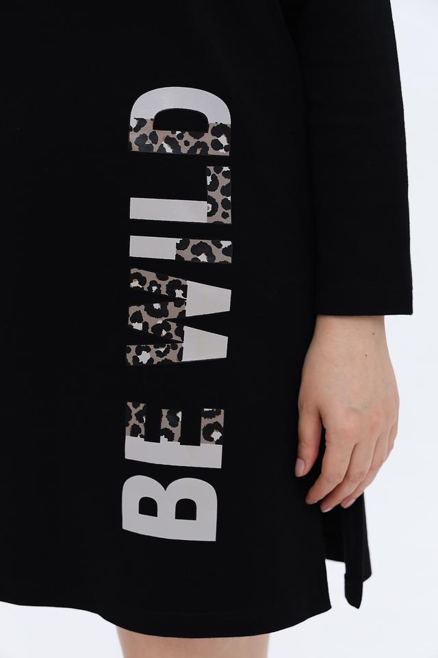 Чёрное платье от Doris Streich с оригинальным дизайном и надписью "BE WILD". Модель выполнена из мягкого и приятного к телу трикотажа, обеспечивающего комфорт в носке. Состав: хлопок 49%, модал 49%, эластан 2%