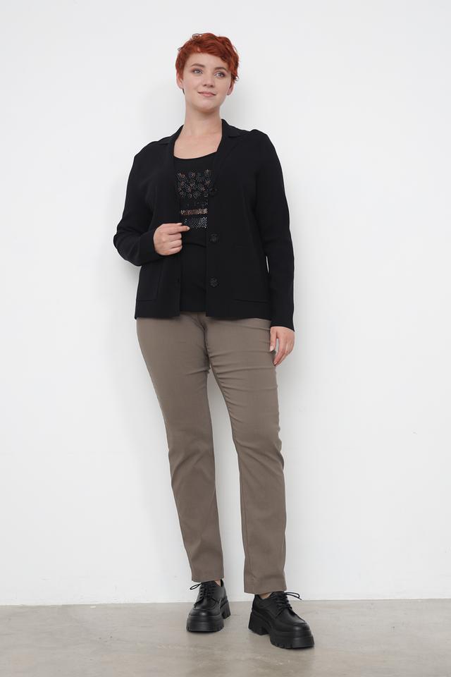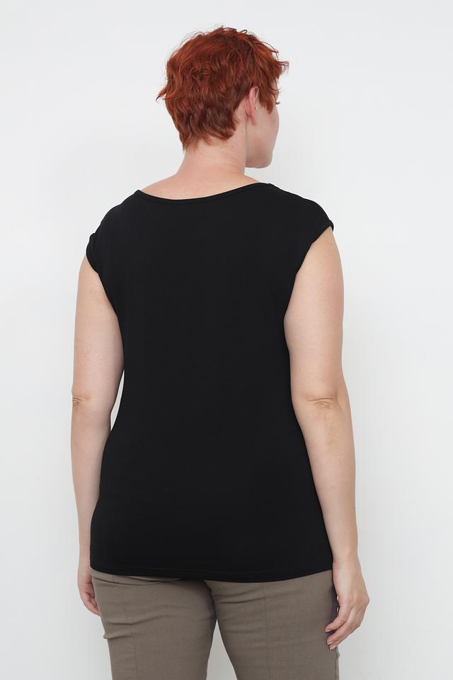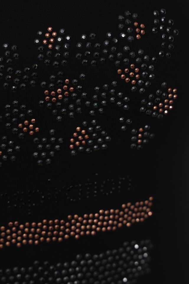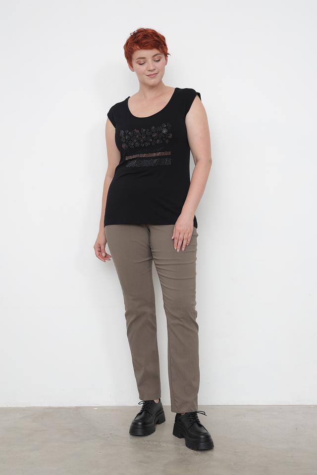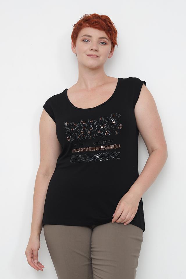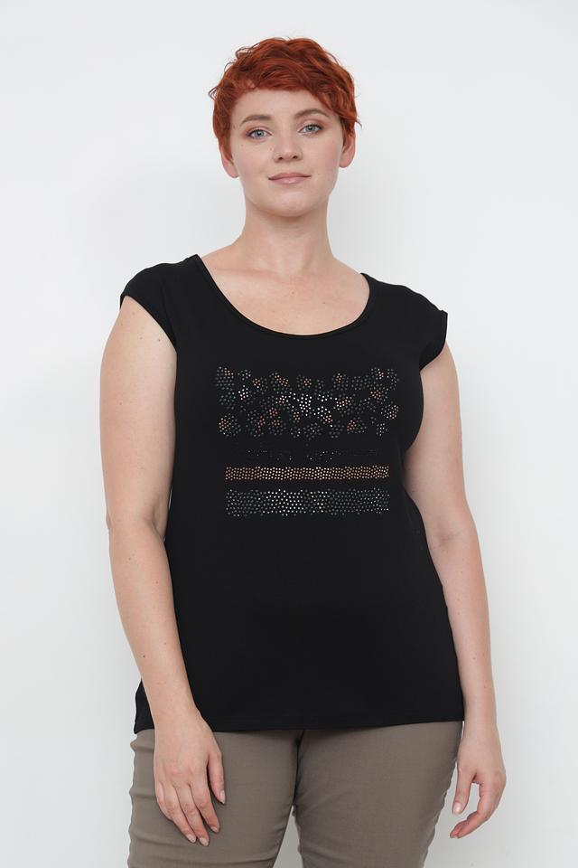 Чёрный топ от Doris Streich с оригинальным декором из страз. Модель имеет круглый вырез горловины и короткие рукава-крылышки, что делает её идеальным выбором для создания стильного и комфортного образа. Состав: вискоза 92%, эластан 8%