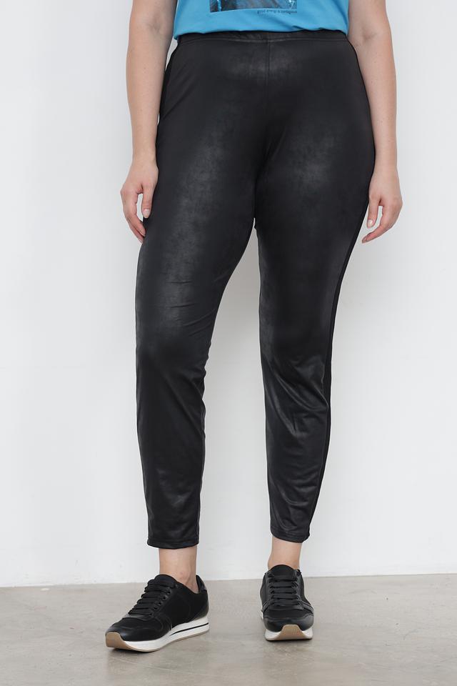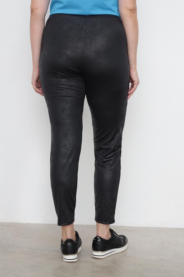 Брюки выполнены из высококачественного полиэстера с добавлением эластана, что обеспечивает комфорт при носке и хорошую посадку по фигуре. Материя имитирует кожу, придавая изделию современный и модный вид. Прямой крой брюк делает их универсальными и подходящими для разных типов фигуры.