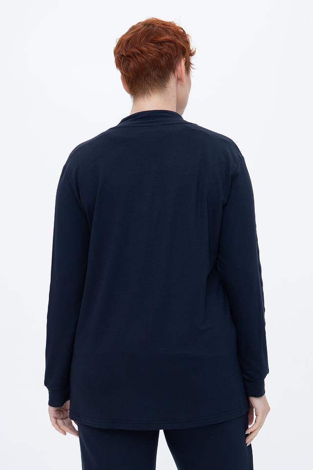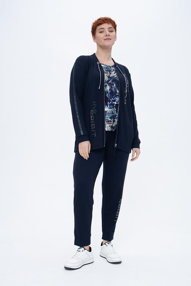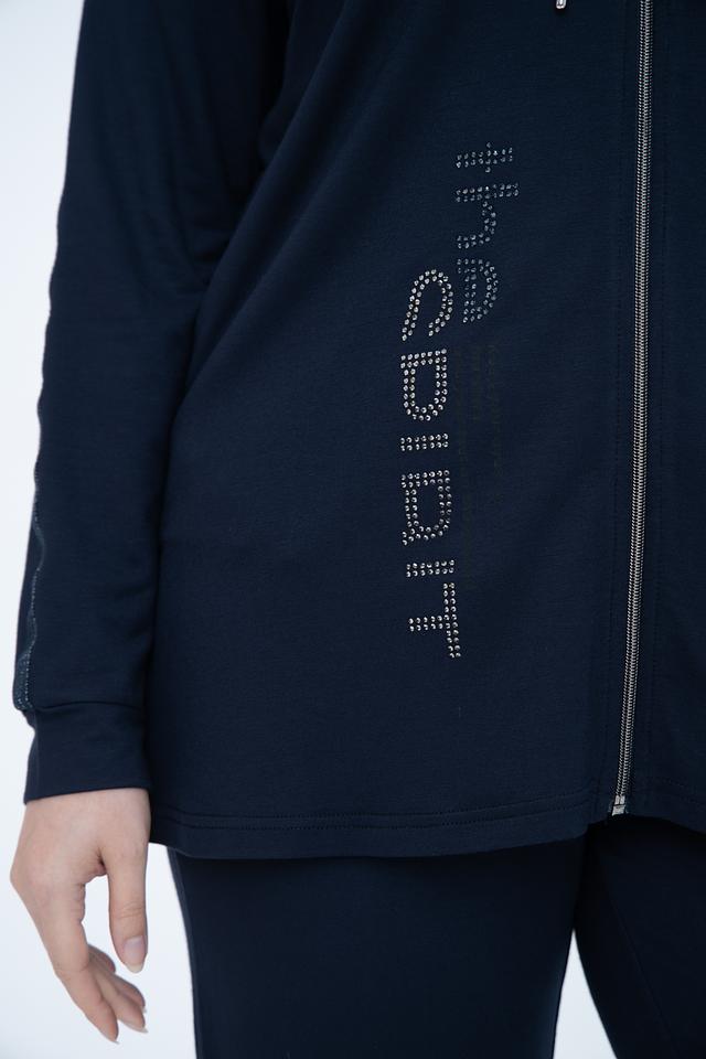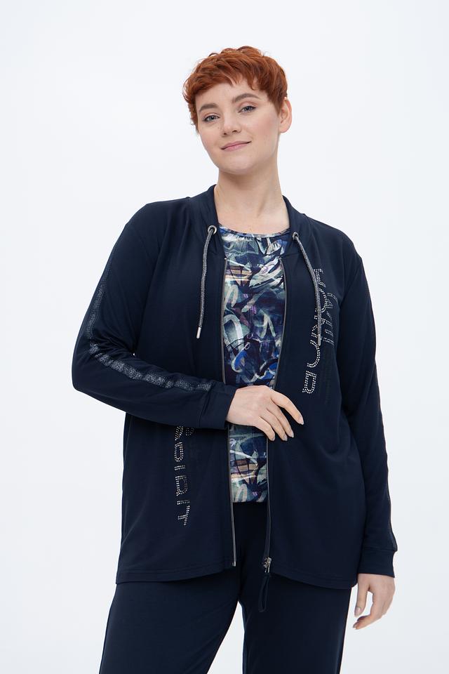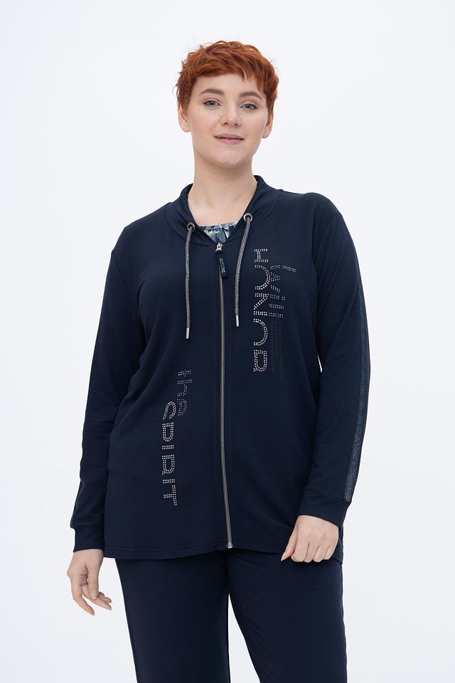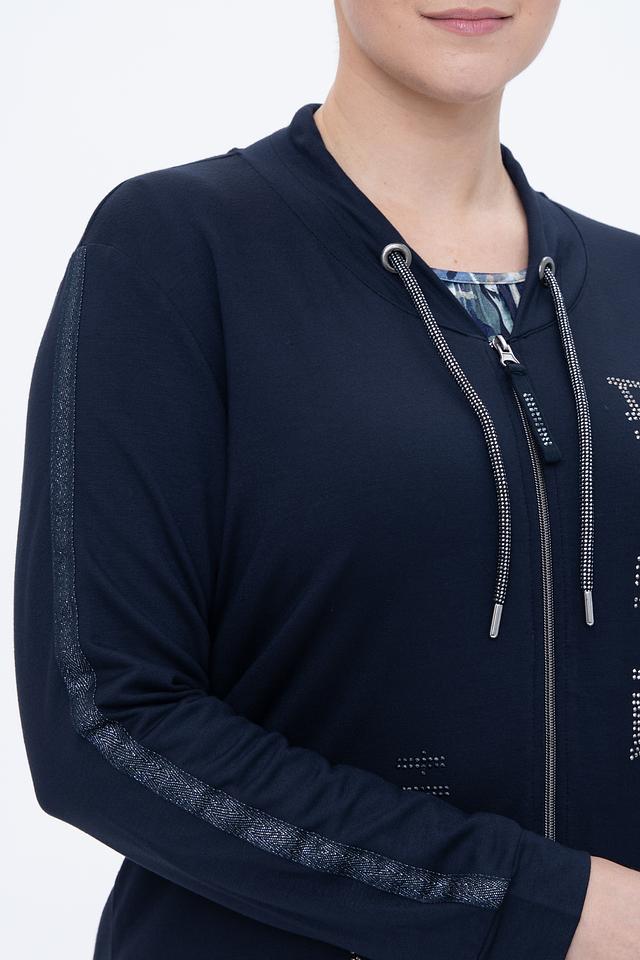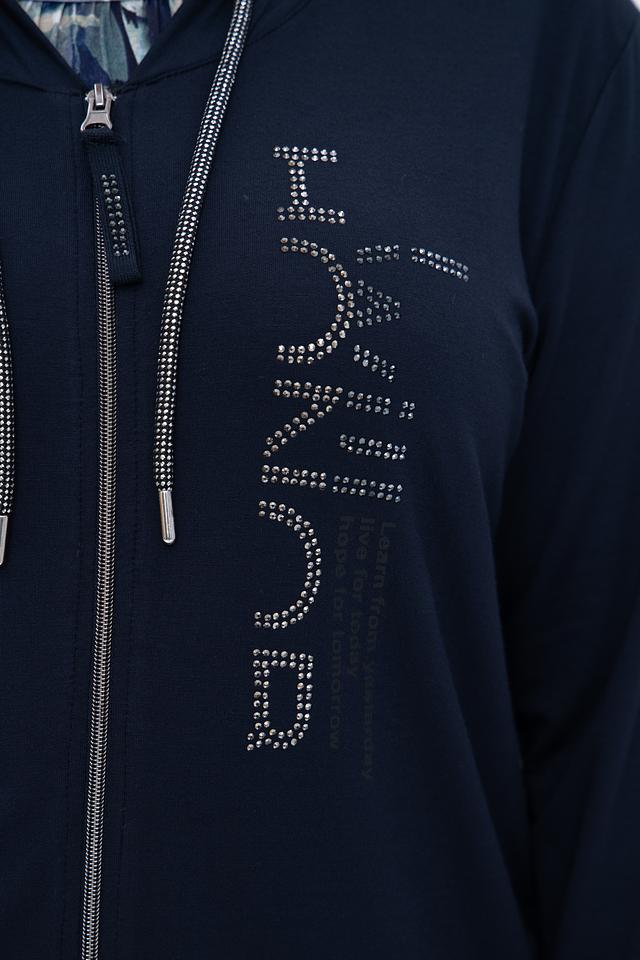 Женская толстовка Doris Streich тёмно-синего цвета с застёжкой-молнией и декоративной отделкой стразами. Модель выполнена из мягкой вискозы с добавлением эластана для комфортной посадки и свободы движений. Состав: вискоза 95%, эластан 5%