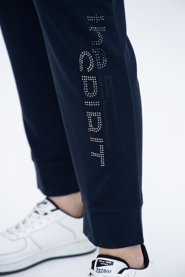 Дизайн брюк дополнен боковой полосой с логотипом бренда, выполненной в контрастном цвете. Удобный пояс на резинке с регулируемым шнурком обеспечивает надежную фиксацию и комфортную посадку. Низ брюк дополнен манжетами, которые аккуратно подчеркивают форму ноги.
