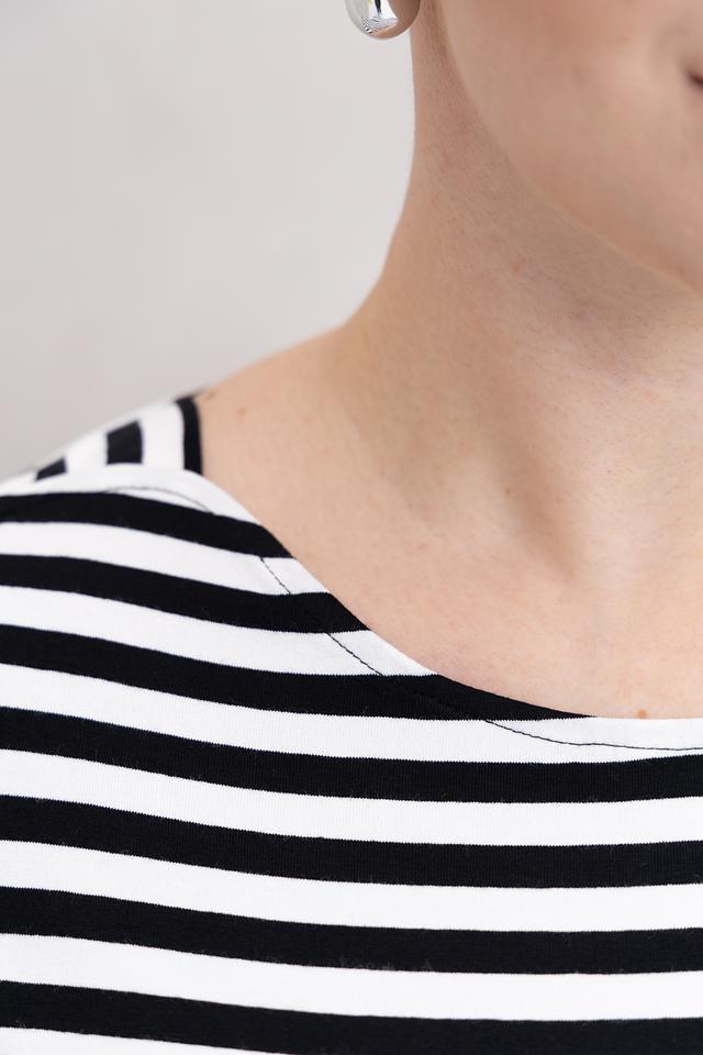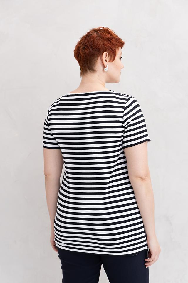 Эта стильная футболка от бренда Doris Streich станет отличным дополнением к вашему гардеробу. Модель выполнена в классическом чёрно-белом горизонтальном полосатом исполнении, что придает ей универсальность и легкость в сочетании с другими вещами.