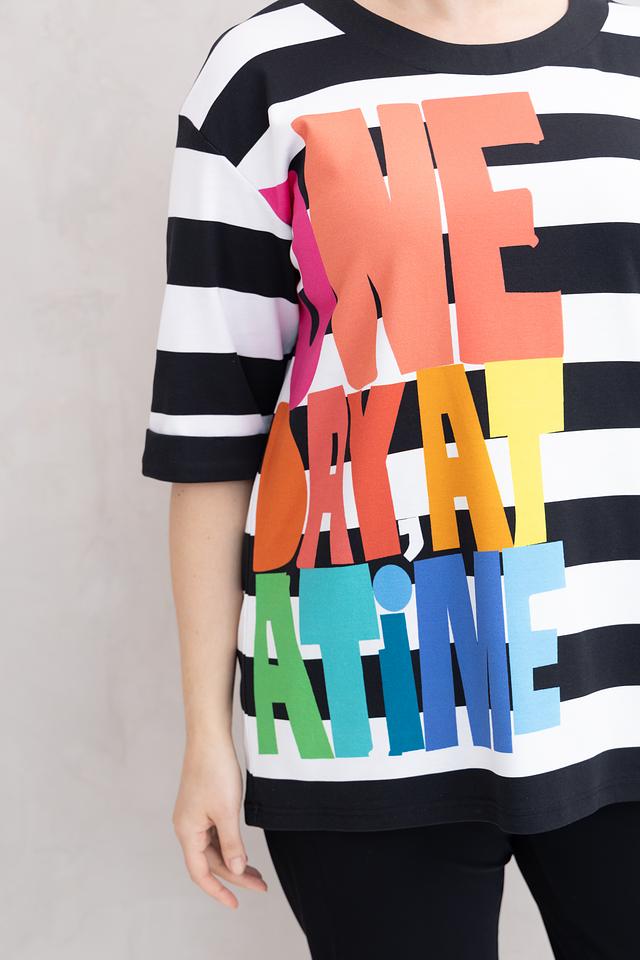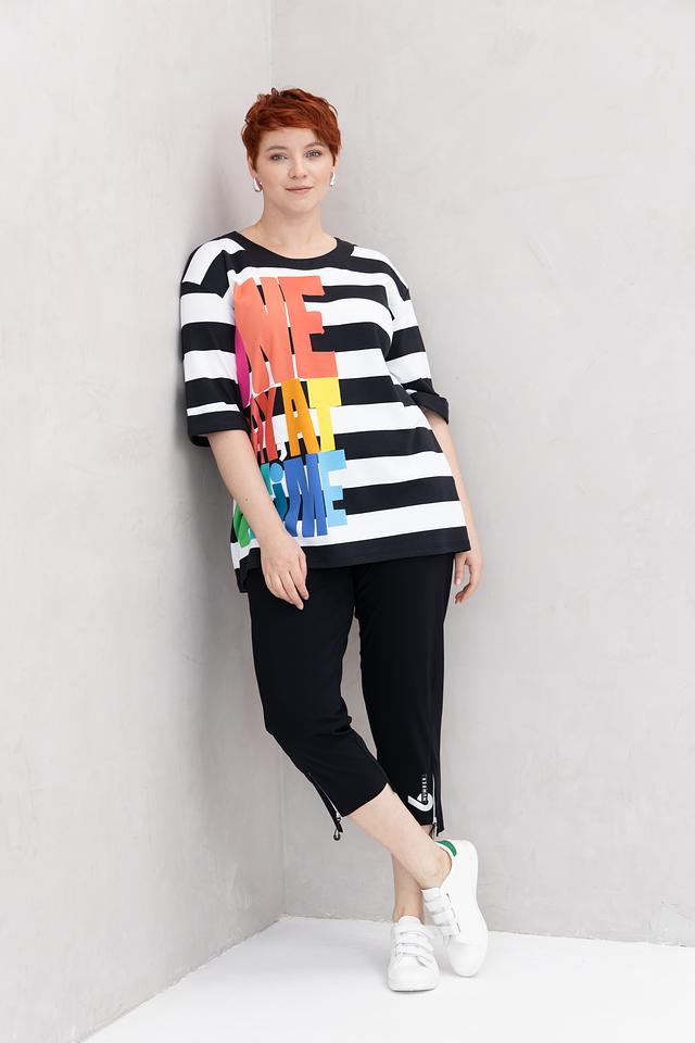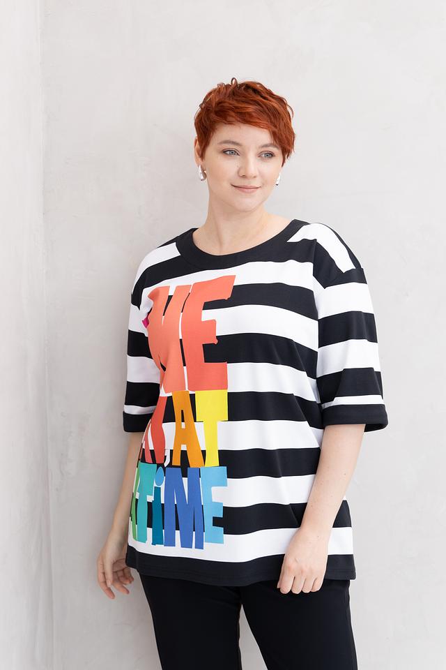 Женская футболка Doris Streich чёрно-белого цвета с ярким радужным принтом "We make a time". Модель свободного кроя с короткими рукавами выполнена из мягкого хлопка с модалом и небольшим добавлением эластана. Состав: хлопок 49%, модал 49%, эластан 2%