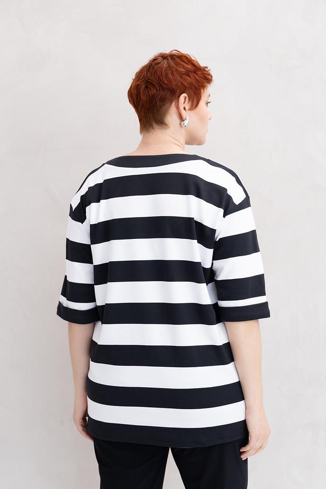 Эта стильная футболка от бренда Doris Streich станет ярким акцентом в вашем гардеробе. Модель выполнена в классическом чёрно-белом горизонтальном полосатом дизайне, который визуально стройнит фигуру.